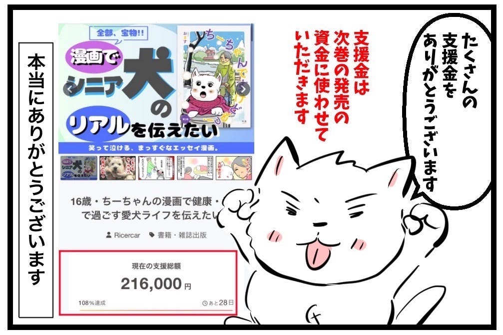 ネクストゴールは50万目指します!おかげさまで初回目標の20万円は突破する事ができました!支援金については前回の活動報告について記載していますのでそちらをご確認ください。今回は大人気の返礼品についてご質問があったのでお答えしていきます。【あなたのわんちゃんの写真を掲載します】大好評につきし初回枠20名が完売しました!ご購入いただいた方々にお礼申し上げます。再申請をして枠を60名に増やさせていただきましたので良かったらご検討ください。大変申し訳ないのですが、返礼品再申請の際には、値段を上げないといけなかったので初回枠より100円アップされています。すみません、、、完全にこちらのミスです、、、ご了承いただければと思います。【多かったご質問について】ー写真はどのタイミングで送ればいいですか?ークラファン終了後にこちらからメールにてご連絡いたします。クラファン終了時から2週間以内を目安にご連絡いたしますので今しばらくお待ちくださいませ。ー写真一枚に2匹愛犬が載っています。こちらも掲載可能ですか?ー申し訳ありません。一枚の写真につきわんこ1匹でお願いします。大切な愛犬のお顔がハッキリ見えるようにご協力をお願いいたします。ーわんこじゃないとダメですか?ー動物だったら、ニャンコや爬虫類、鳥さん、うさぎさんなどでも大丈夫です!もちろんウエスティだけでなく、色々な犬種のわんこ達をお待ちしています!また、お空組のみんなの参加もお待ちしています!たくさんのお友達と一緒に本に思い出を残せる事を楽しみにしています!その他ご質問などありましたら、メールにてお問い合わせか、お気軽に作者にDMくださいませ。引き続き応援をよろしくお願いします。たくさんありがとうですけどもっ