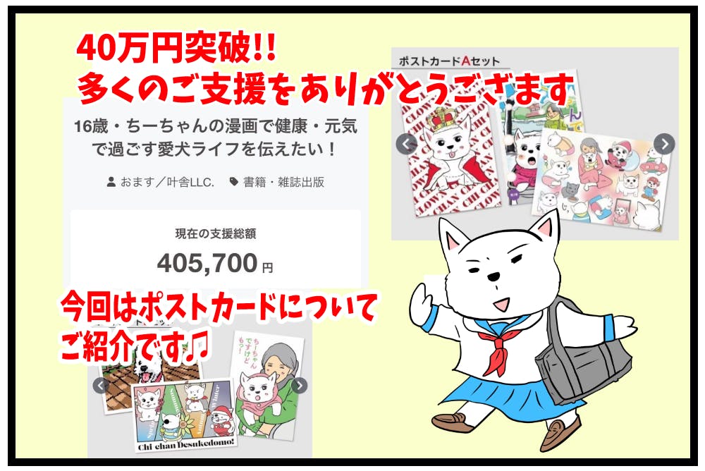 ご支援金40万円を突破しました!多くのご支援をありがとうございます。ご支援金は次回の書籍制作費とちーちゃんですけどもっ英語版の制作費に使わせていただきます。詳しい制作費の内訳こちらのリンクにてチェックしてください↓支援金の使い道についてさてさて今回は返礼品のオマケについているポストカードをご紹介します。【クラファン限定!ポストカード】こちらはクラファン限定描き下ろしポストカードになります。第3巻に掲載されているイラストを集めたちーちゃんから季節のちーちゃん、抱っこちーちゃんなど全て描き下ろし!ドット柄ちーちゃんも作者が全て手描きしました!きちんと投函できるハガキサイズです!【ちーちゃんですでもっ!の表紙は季節順!】実はちーちゃんですけどもっの表紙は、普段ちーちゃんがお散歩している道や風景を描いています。実は季節を変えているのはご存知でしょうか?第1巻は夏をテーマに!入道雲が清々しい青い空をバックに、いつもお散歩している家の前の通りを描いています。ちーちゃんの住む地域は夏の七夕祭りが有名です。第二巻は秋をテーマに!秋の夕暮れをテーマに、ちーちゃんカーに乗ったちーちゃんが描かれています。実はちーちゃんのお散歩方法も変えていて、今回は犬よう自転車に乗ったちーちゃんが登場!背景はちーちゃんの近所の商店街のアーケードがみえます。そして第3巻は冬の表紙で登場!カートに乗って、公園をお散歩するちーちゃんが登場。雪が大好きなちーちゃんが雪が降ってきて驚いてる様子が描かれています。この公園は電車で10分ほどにある自然公園で、ボートも有名です、冬らしくも暗くない明るい色合いで描きました。マフラーはフォロワーさんの手作りなんですよ。その他、描き下ろし漫画やコラム、後書きと充実しているので第3巻も楽しみにしていて下さいねっ!プロジェクト終了まで楽しんで参加していただきたいので、こういった製作の裏話も載せていければと思います。引き続き応援いただければ幸いです。いつも応援をありがとうございます。