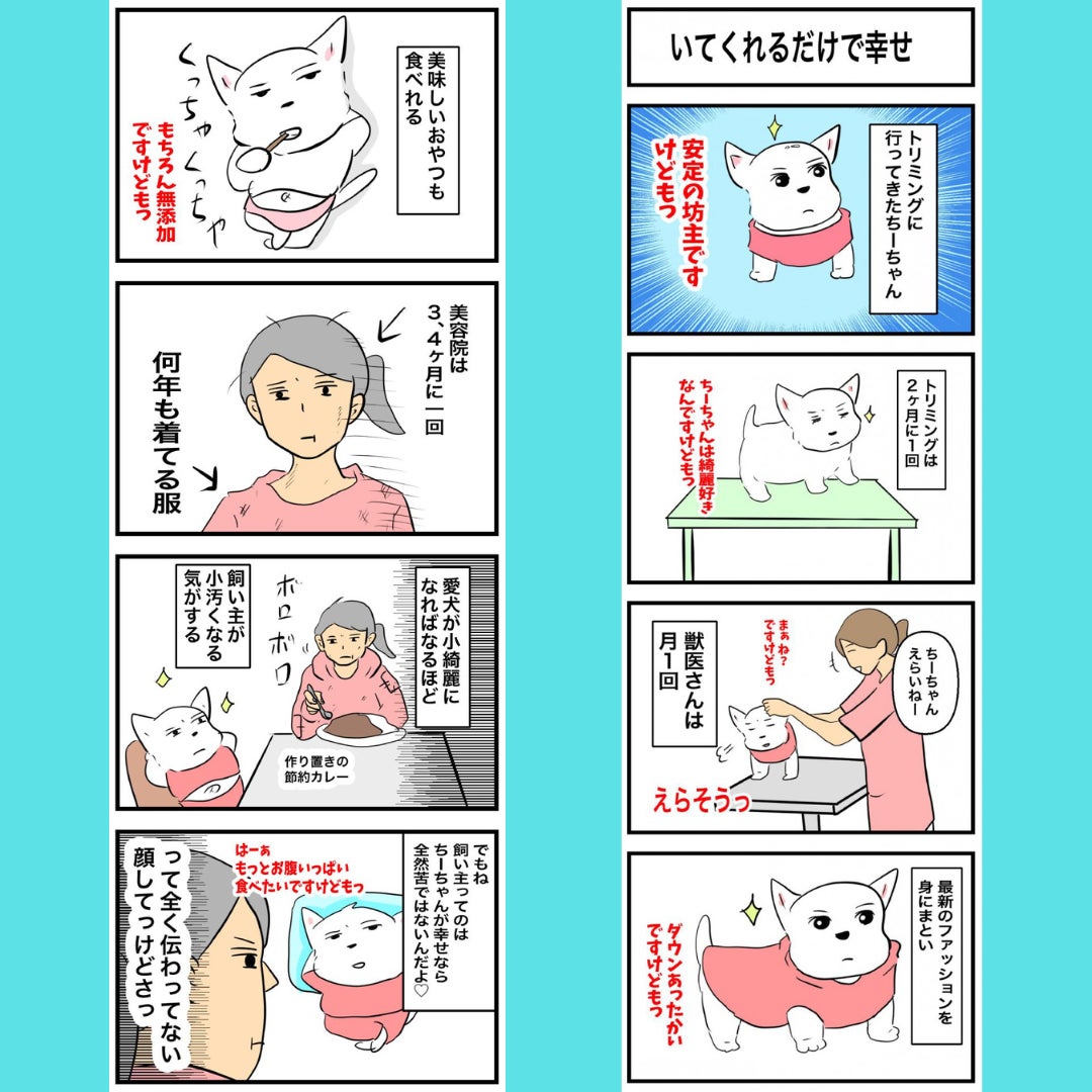 『ちーちゃんですけどもっ!』では、そんなちーちゃんとの生活を、笑いあり、涙あり、そして少しドタバタな毎日を飼い主の目線で描いています。