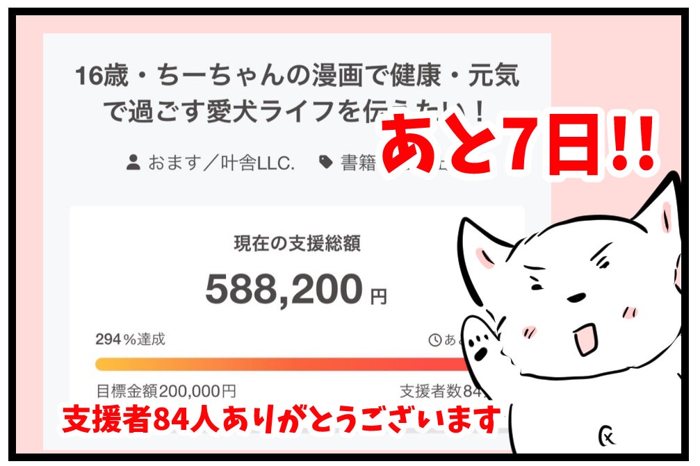 2025/06/24 19:30支援金588200円 84人!!多くの方々にご支援をいただきありがとうございます。ご支援金の使い道については以下をご参考ください↓ご支援金についてちーちゃん英語ver第3巻について【ラスト1週間オススメ返礼品をおさらい!】 人気の返礼品はこちら①別冊付録は完全描き下ろし漫画!ちーちゃんの赤ちゃん時代の時のお話を収録※通常のコミックもつきます②あなたのわんちゃんを掲載します③コミック+ステッカーセットステッカーサイズは4センチ×4センチ以内防水仕様でバイクや車にも貼り付け可能です!屋外仕様OK約1ヶ月に渡り行ってきたクラファンですが残り1週間を切りました。一生懸命用意して準備しました。この企画を通してちーちゃんですけどもっを知っていただければ幸いです。ご支援金はコミック制作費に使わせていただきます。より良いコミックを作ることで皆様に還元できればと思います。本当に多くの方々にご支援していただいてありがとうございます。残り僅かとなりましたがよろしくお願いします。 もっと見る