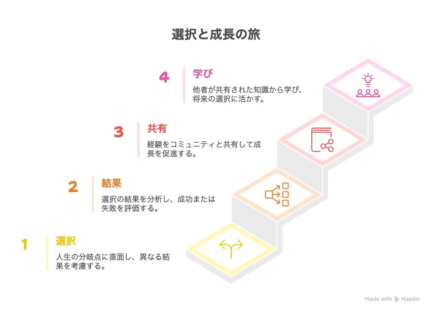 1.人生の選択を可視化・共有するプラットフォームの構築と拡張 選択の記録を集積・分類し、個人が自身や他者の分岐点を検索・参照できる環境を提供します。