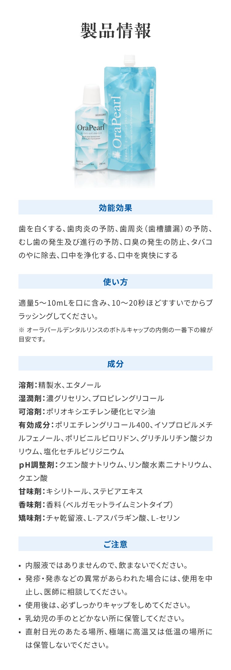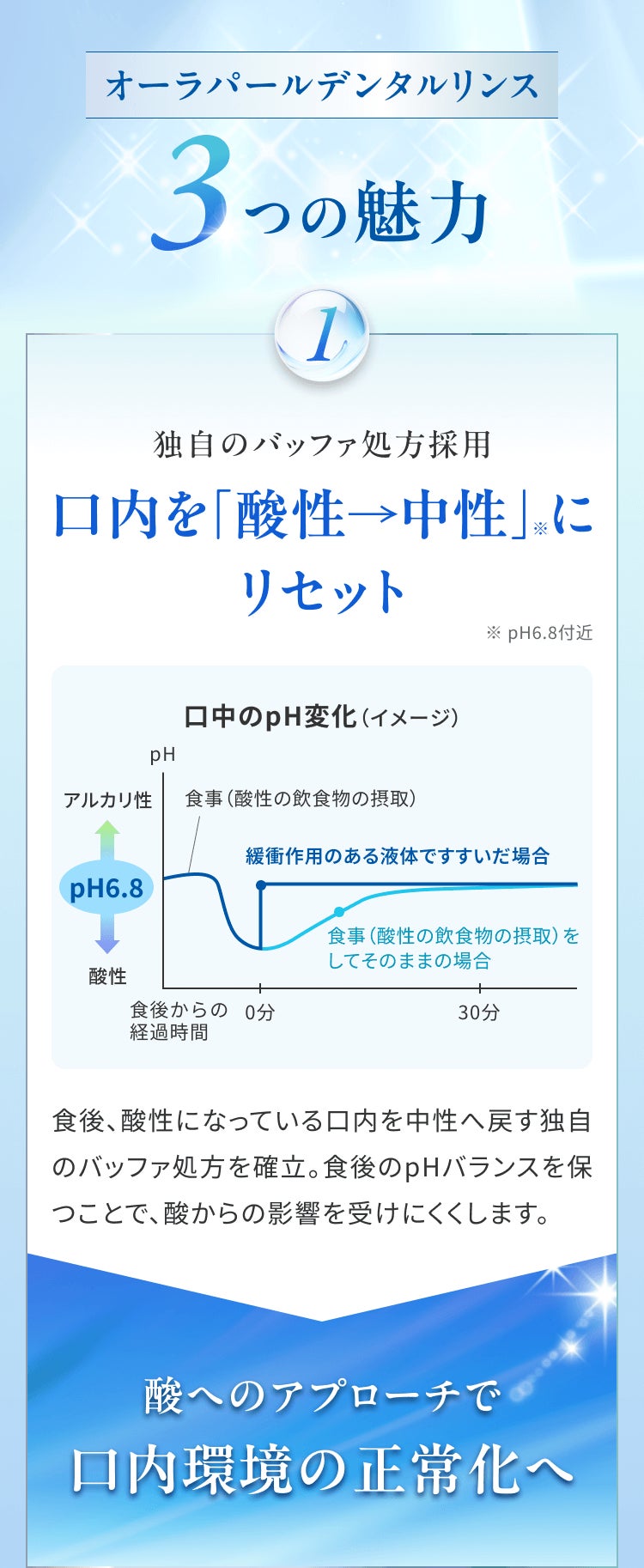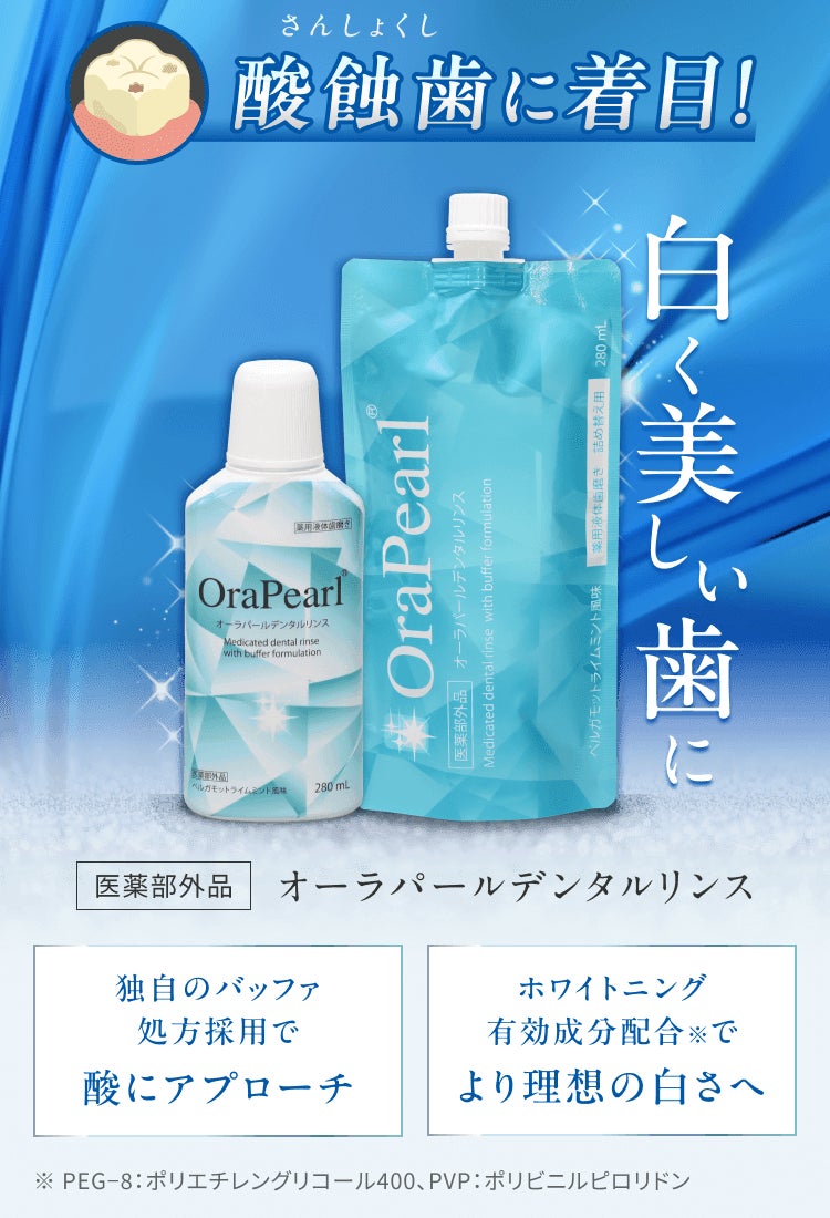 「オーラルケア」にも力を入れており、虫歯や歯周病(歯周炎、歯肉炎)だけでなく、近年注目されている「酸蝕歯(さんしょくし)」に着目した【医薬部外品】のデンタルリンスを開発しました。