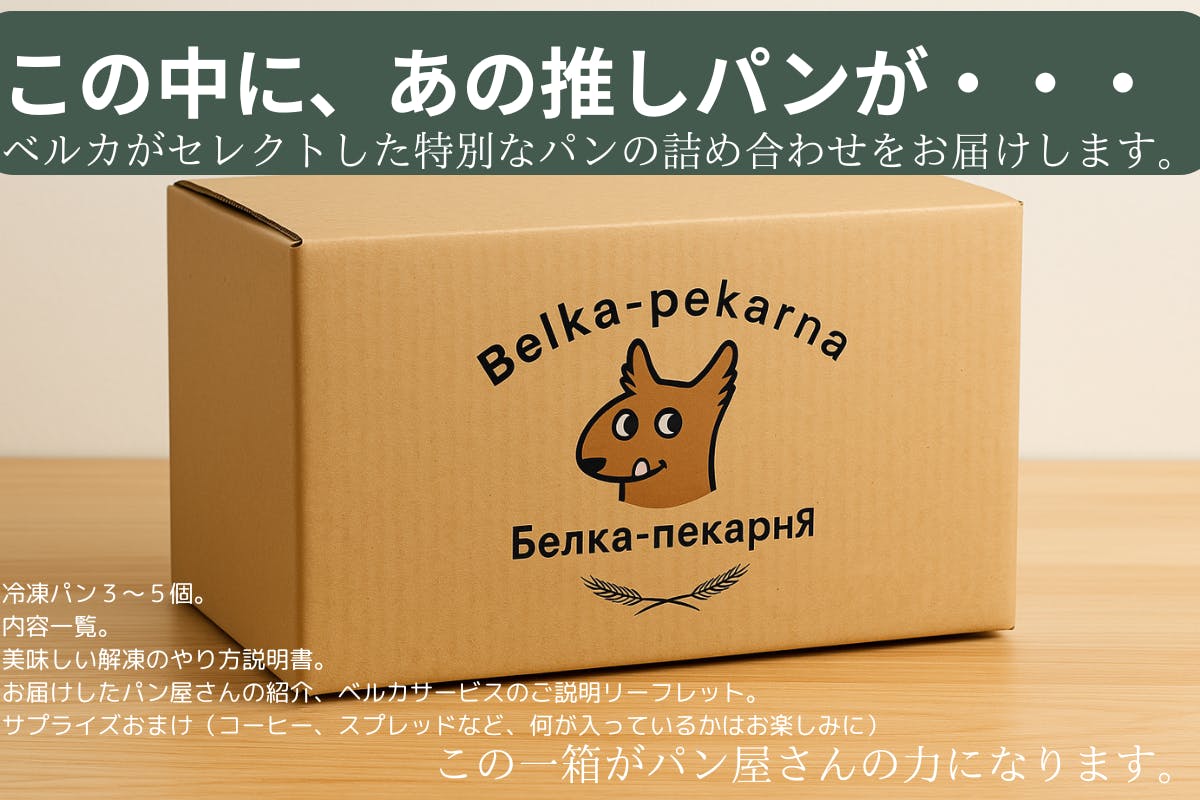 リターンの中心には、ベルカがセレクトしたパンの詰め合わせをお届けします。どのパン屋のどのパンが届くかはおまかせとなりますが、それも「推しパンとの冒険」のひとつ。ベルカがセレクトしたパン職人が丁寧につくったパンを冷凍便でお届けします。