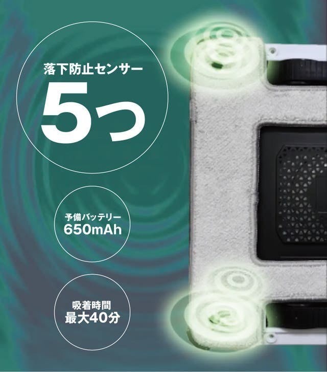 また突然の停電が発生したとしても、内蔵の650mAhの予備バッテリーを使い、最長40分間は窓ガラスに貼り付いた状態をキープ。