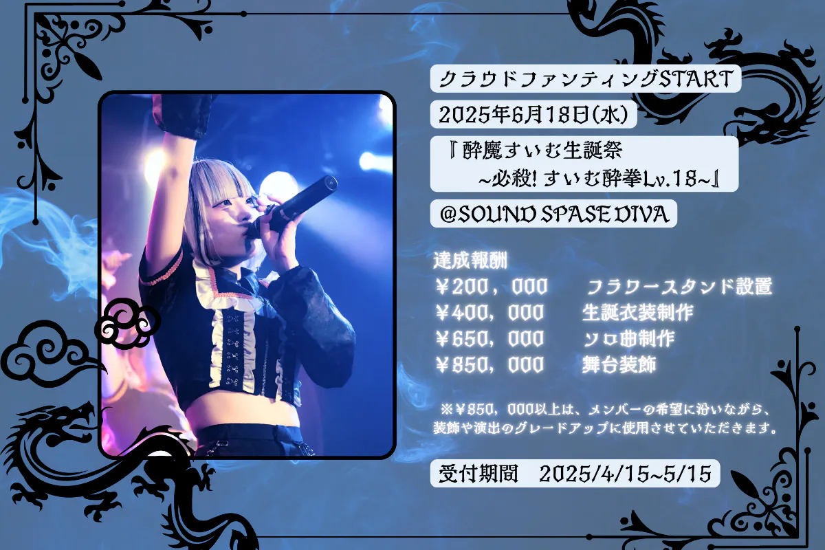 2025年6月18日に名古屋SOUND SPACE DIVAで開催されるアイドル「酔魔すいむ」の生誕祭です。今回は、彼女の生誕祭を成功させるために、彼女を応援する全てのファンの力を集結させたいと考えています。