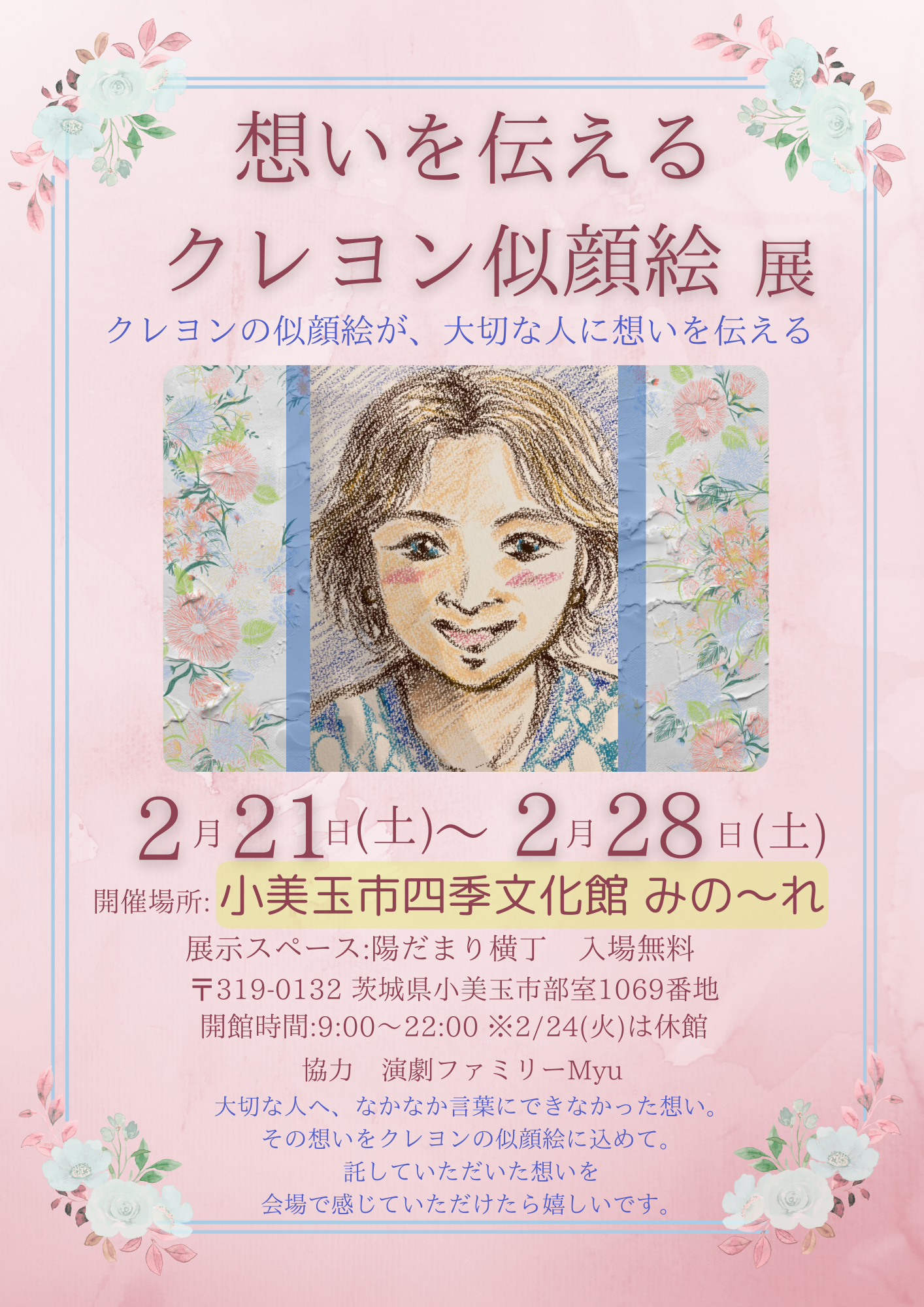 2026/01/27 15:24想いを伝える似顔絵展示会開催のお知らせ昨年は、クラウドファンディングでのあたたかい応援・ご支援を、本当にありがとうございました。応援していただいたプロジェクトの目標であった“想いを伝える似顔絵の展示会”を開催できることになりました。この展示会は、似顔絵を通して、大切な人に想いが伝わるということを知っていただきたい、そんな想いから生まれたものです。そして、この想いを形にすることができたのは、応援し、支えてくださった皆さまおひとり、おひとりのおかげです。本当にありがとうございます。---------------------------------------------展示会のご案内「想いを伝える似顔絵の展示会」【展示期間】2026年2月21日(土)〜2月28日(土)※2/24(火)は休館【開館時間】9:00〜22:00【開催場所】小美玉市四季文化館 みの〜れ〒319-0132 茨城県小美玉市部室1069(協力 演劇ファミリー Myu 様)【展示スペース】「陽だまり横丁」の一部スペースをお借りして展示させていただきます。【入場料】 無料【在廊予定日】21(土),22(日),23(月),28(土)直接お会いできましたら、とても嬉しいです。【似顔絵コーナー】会期中の土日祝限定で、似顔絵を描かせていただきます。詳細は現在調整中のため、決まり次第あらためてご案内いたします。------------------------------------------皆さまから託していただいた想いが、似顔絵一枚一枚に込められています。もしお近くにお越しの際は、ぜひお気軽にお立ち寄りください。今後とも、よろしくお願いいたします。クレヨン似顔絵作家西口栄里奈 もっと見る9/30(火)無事公開終了しました
