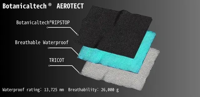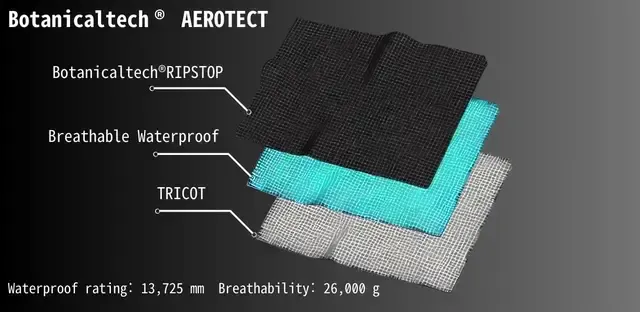 100mm前後の雨や風の侵入を防ぎつつも、服の中に溜まってしまう湿気は逃したいという、日本の梅雨や夏場の台風にも凌げる快適な環境をつくる高機能な素材が、この「Botanicaltech® AEROTECT」という新素材です。