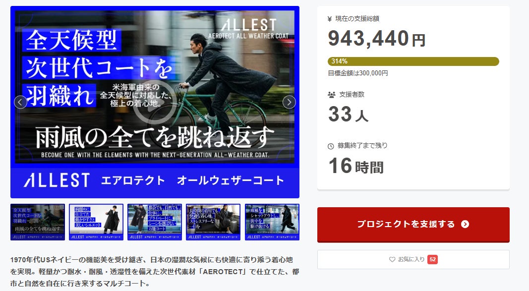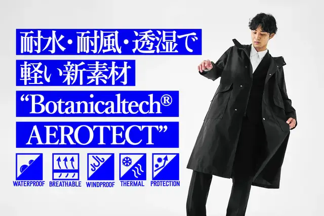 前回の「エアロテクトファティーグパンツ」で目標額を大きく上回るほど人気を博した、新素材「Botanicaltech® AEROTECT」シリーズの第二弾「エアロテクトオールウェザーコート」です。