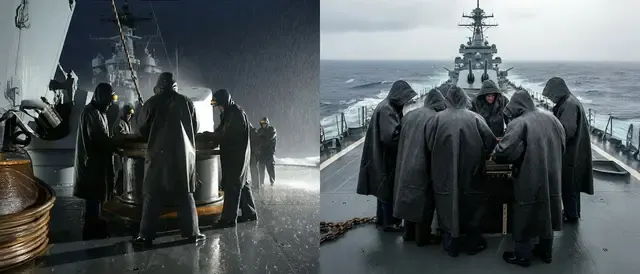 1970年代にアメリカ海軍の作業服として、船上や海上での作業時に使用されていました。当時の軍事規格や気象条件に基づいて開発されました。