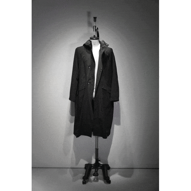 この素材が前作のファティーグパンツ向けのAEROTECTを更にコート向けに軽快にするため、改良検討を重ねて、やっと今日を迎えられました。トウモロコシ由来のBotanicaltech®で軽量且つ強靭なRipstopを作って、更に全天候型の透湿防水シート膜を導入し「AEROTECT」を開発しました。その後コートにした時の重さ、裏側の色がファティーグパンツは白濁色でしたので、パンツでは良かったしっかり感をコート用に黒に軽量&改良しました。