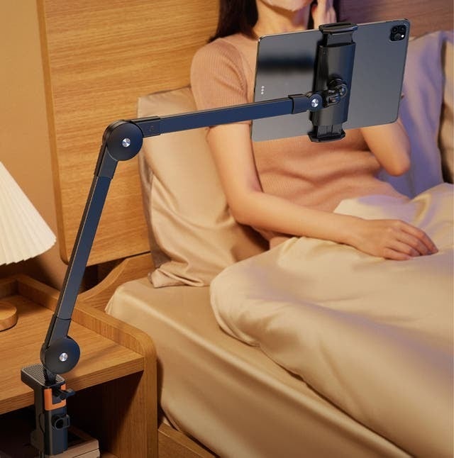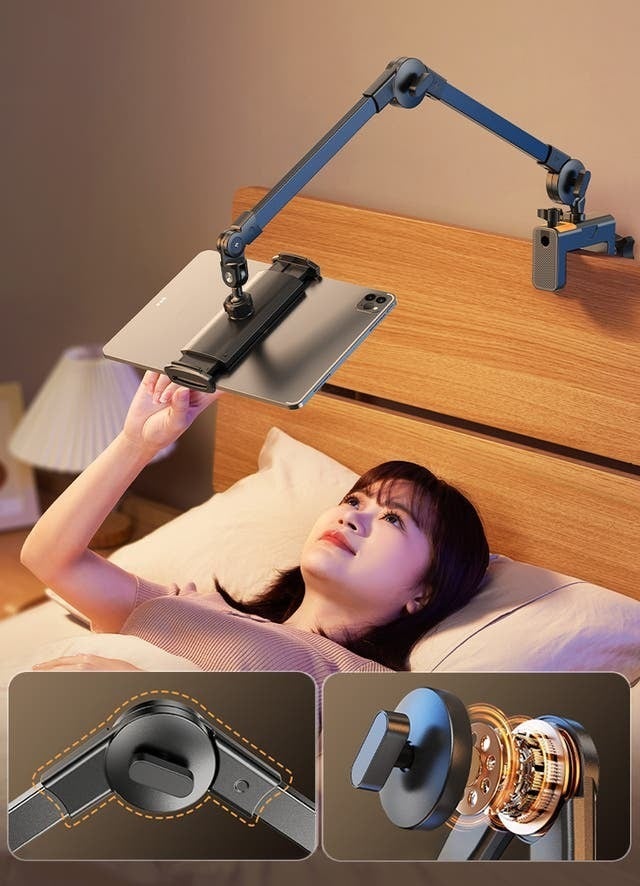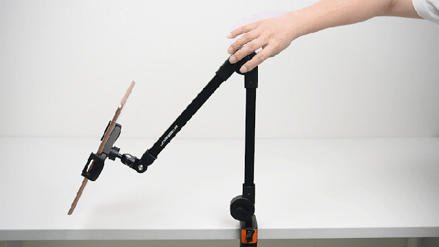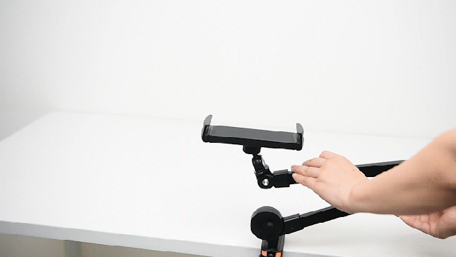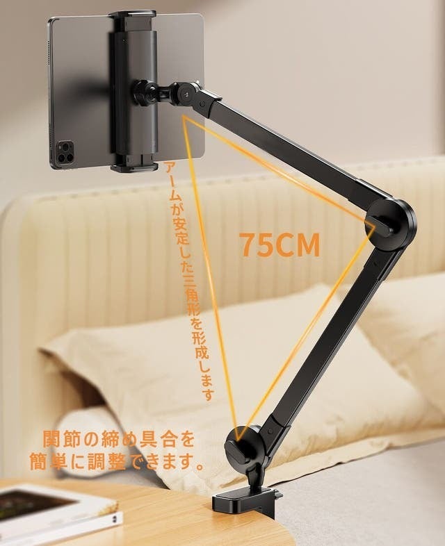 現在、仕様をアップグレードし、アームの長さを1/3延長して全長を75cmにしました。これにより、座っていても横になっていても、画面を操作するのがより便利になりました。また、関節の締め具合を簡単に調整でき、お好みな角度に固定することができます。