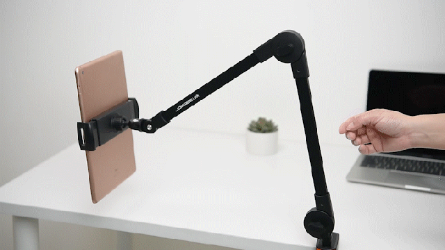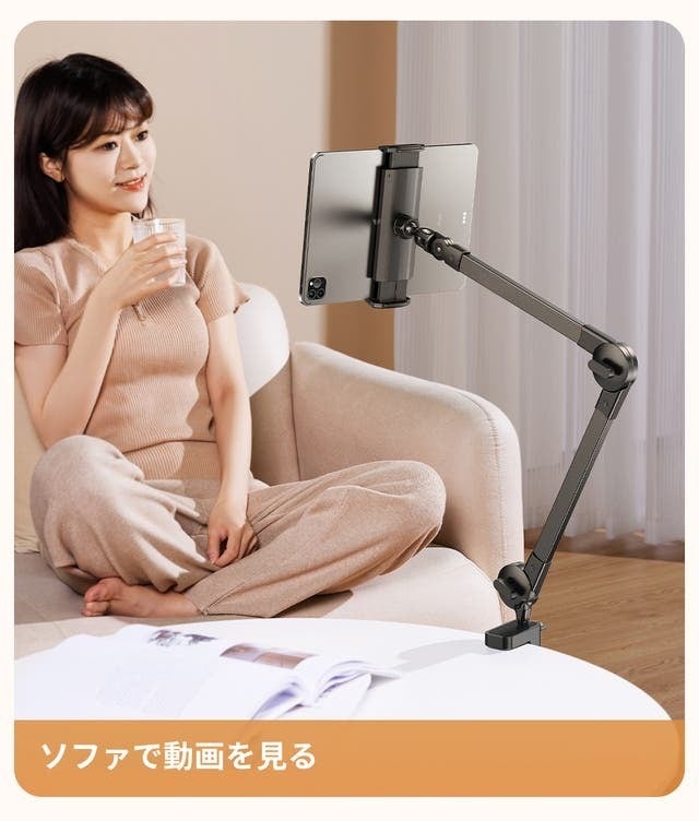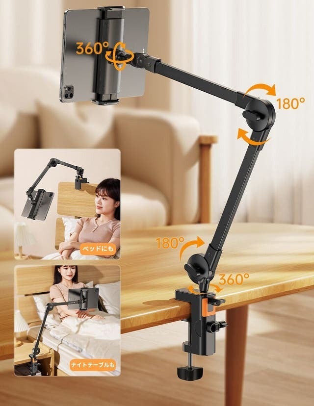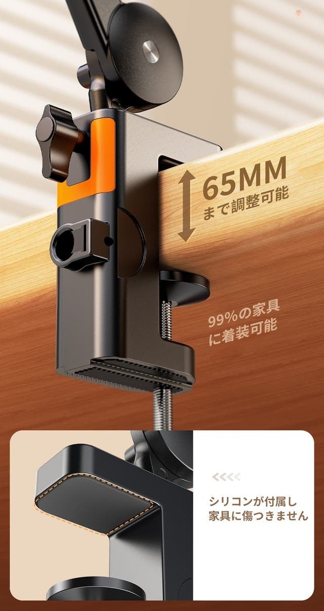 「CT12」アームスタンドはクランプ式なので、ネジでテーブルやベッドなどに固定できるタイプで、安定感が抜群です。高さと角度マルチ調節でき、適切な高さに調整し、首や肩の負担からあなたを守ります。組み立て方法は2つがあり、仕事の時にも家でのリラックス時にもより適しています。