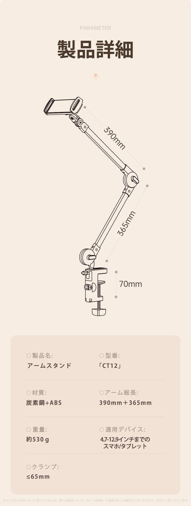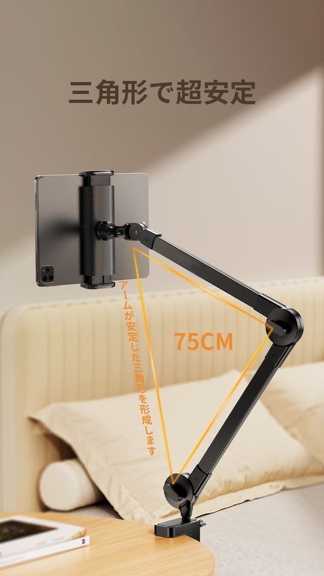 アームの総長は75cmであり、ほとんどのシーンに対応できる設計になっています。アームの長さが十分にあるため、広い範囲で自由に角度や位置を調整することができます。