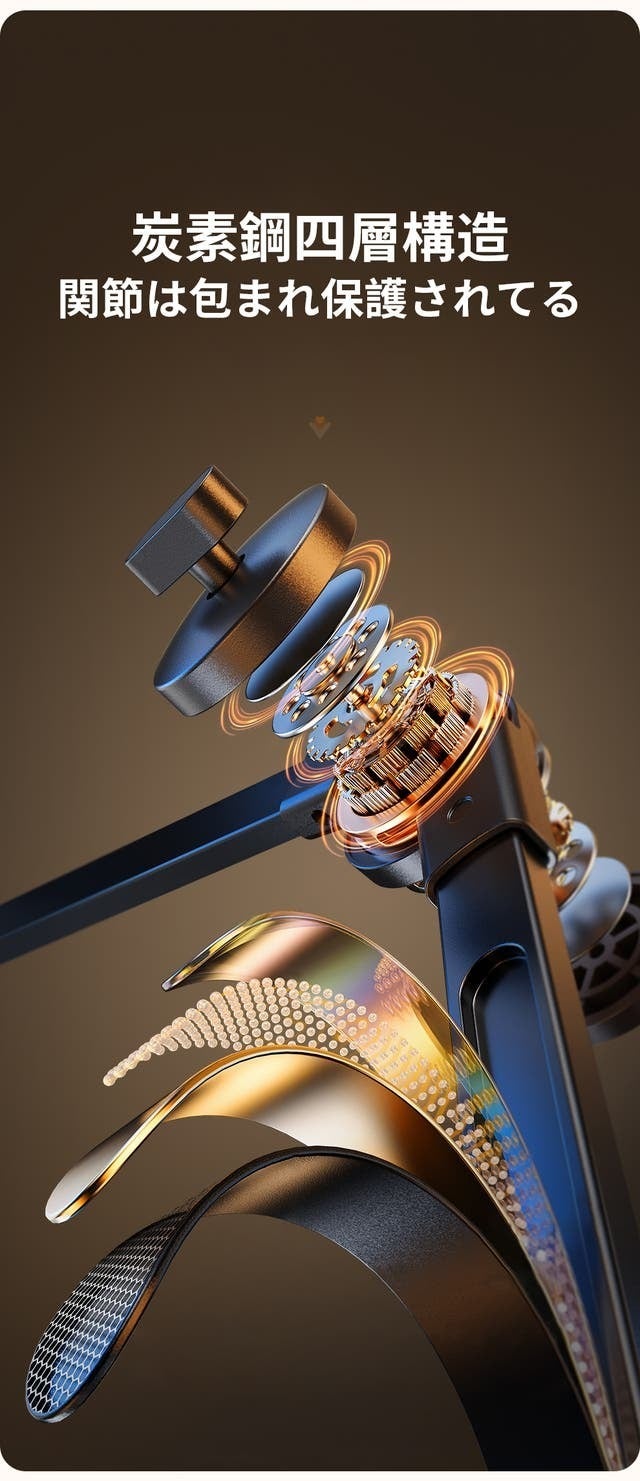 従来のスタンドは不安定で落下しやすいか、素材の耐久性が低い場合があります。この製品は炭素鋼の四層構造で、高い安定性と耐久性を誇っています。2本のアームが安定した三角形を形成します。安定性が抜群、揺れる心配はありません。