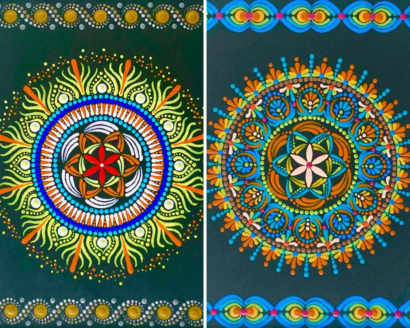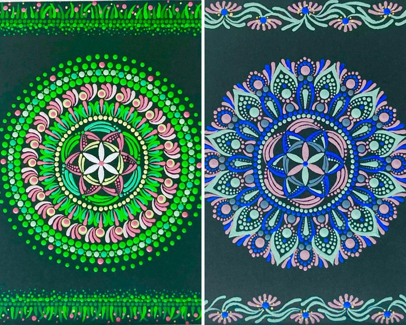 「新緑」をイメージしたドットマンダラです。新芽の深くて濃厚な緑の香りが伝わったら嬉しいです。外側の模様は草原に咲くお花畑のイメージです。