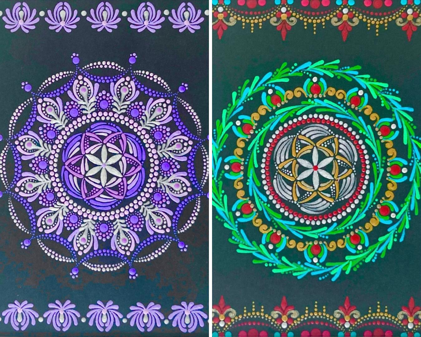 クリスマスをイメージしたドットマンダラ。こちらはリターンの【感謝のメッセージ】(ポストカード)にも使用します。ぜひ、今年のクリスマスの飾りにドットマンダラをプラスしてみてください。