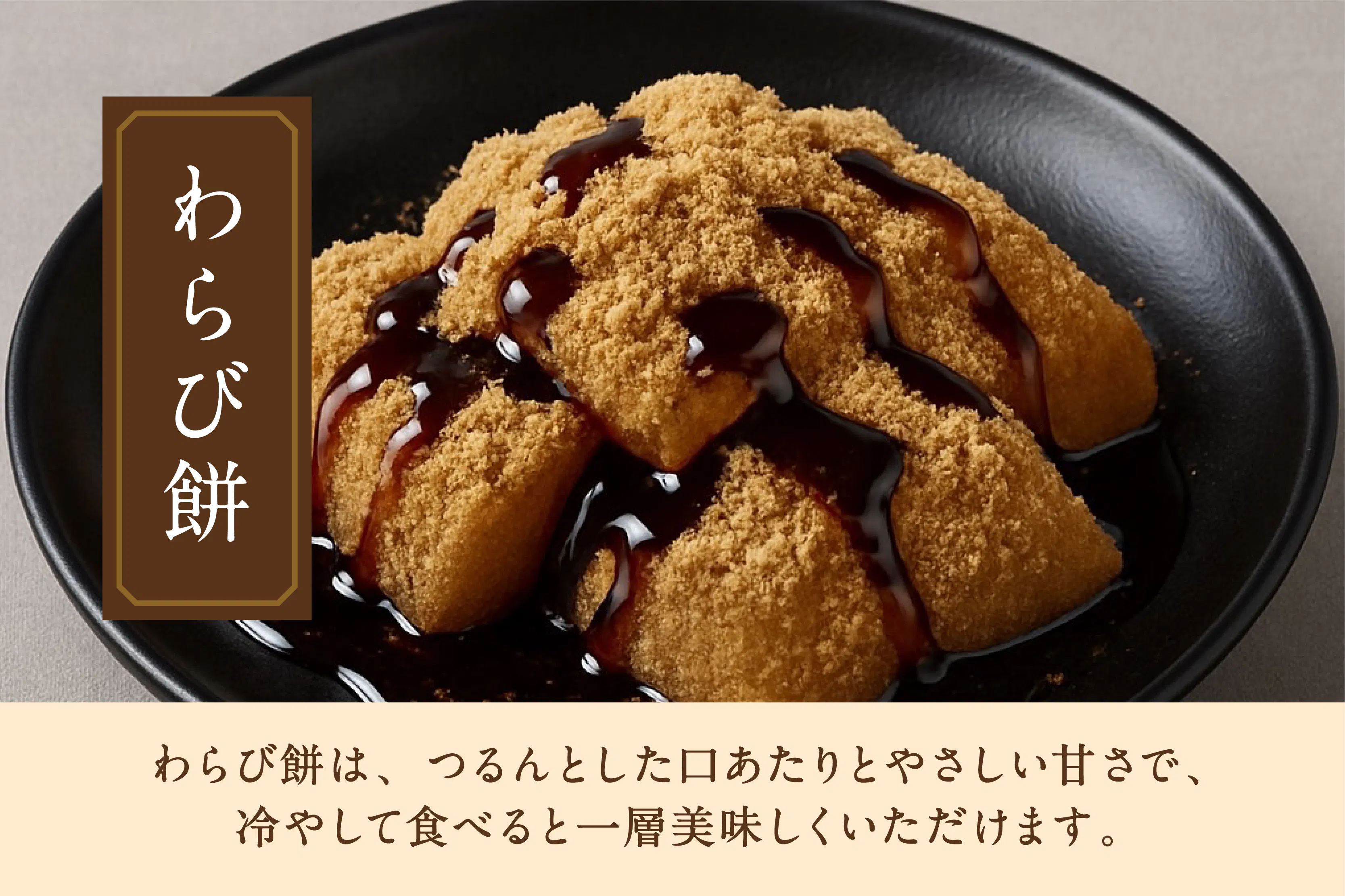 ≪国産餡≫にこだわった特製柔らか大福、きなこ・黒糖(別添え)付きの特製わらび餅です。