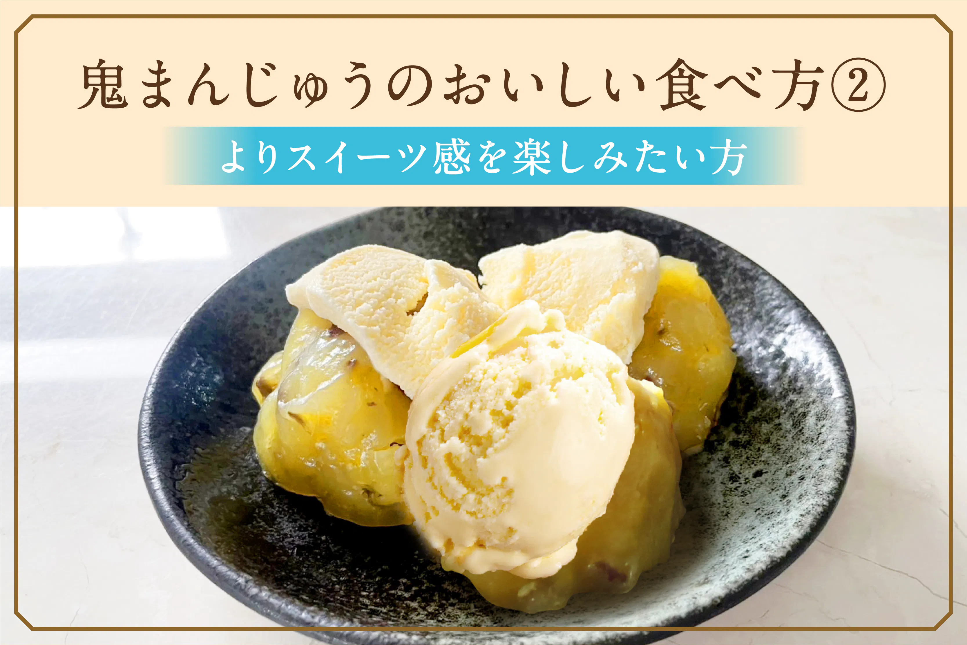 温めた鬼まんじゅうにバニラアイスをトッピングするとよりスイーツ感が増します。
