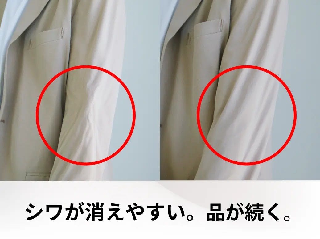 気になるスーツのシワも一瞬で整います。動画のように手でぎゅっと握ってできたシワでも消えやすいです。