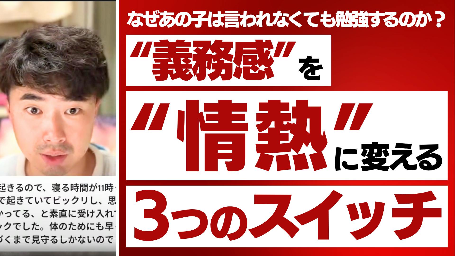 なぜ、あの子は言われなくても勉強するのか?“義務感”を“情熱”に変える3つのスイッチ動画アーカイブはこちらhttps://youtube.com/live/YSgxo0Fwl7Q「深夜1時まで起きている息子。注意したら『うるさい!』と反抗された」 「『勉強しなきゃ』と思うほど手につかず、精神的に参ってしまった娘」これらは先日、私のライブ配信に寄せられた、お母様方からの切実な悩みです。子どもの将来を想うからこそ、私たちはつい「〇〇しなさい!」と正論をぶつけてしまいます。しかし、その言葉が、かえってお子さんを苦しめ、やる気を削ぐ“呪い”になっているとしたら?実は、これらの問題の根底には、共通する一つの原因があります。それは、「〜しなければならない」という強烈な“義務感”です。今回は、この義務感という呪いを解き放ち、お子さんの心に眠る「やりたい!」という情熱に火をつけるための、具体的な「3つのスイッチ」についてお話しします。スイッチ①:心のスイッチ 〜 “声かけ”より“親のあり方” 〜「朝、バタバタしている子どもに、どんな声をかければいいですか?」こんなご質問をよくいただきますが、私が最も大切だと考えているのは、何を言うか(What)よりも、親がどんな状態でいるか(Be)です。同じ「ふざけんなよ」という言葉でも、笑顔で言われるのと、怒りの形相で言われるのとでは、伝わる意味が全く違いますよね。コミュニケーションの本質は、言葉ではなく、その裏にある感情やエネルギー、つまり非言語情報にあります。お子さんが言うことを聞かないとき、私たちがまず見直すべきは、子どもへの声かけのテクニックではありません。親であるあなた自身の「心の平穏」です。「〇〇させなきゃ」という焦りや不安を抱えたままでは、その緊張感が必ずお子さんに伝わります。まずは深呼吸をして、ヨガやストレッチ、短い散歩でもいいので、ご自身の心を整える時間を作ってみてください。親がどんと構え、心に余裕を持つこと。その穏やかで安定した「あり方」こそが、お子さんの心を安心させ、素直に行動するための土台となる、最初のスイッチなのです。スイッチ②:環境のスイッチ 〜 “やりたくなる”を設計する 〜「勉強しなきゃ、と思えば思うほど手につかない」 この状態こそ、「〜しなければならない」という義務感の呪いが最も強くかかっている証拠です。断言しますが、人間は「義務感」というエネルギーだけでは、継続的に行動することはできません。ではどうするか? 答えはシンプルです。「どうすれば“やりたい”に変えられるか?」を考えることです。親は、子どもの監視者や管理者ではありません。子どもが思わず夢中になってしまうゲームを設計する、優秀なゲームデザイナーになるのです。ゲーム性を取り入れる ただ「やりなさい」ではなく、「この1ページ、何分で終わるか競争しよう!」とタイムを計るだけで、勉強はエキサイティングなゲームに変わります。空間をデザインする 私は、自分の仕事机の周りに大好きなフィギュアをたくさん置いています。それは、「この空間にいたい」と思えることが、「ここで仕事がしたい」という意欲に直切に結びつくからです。お子さんの勉強部屋を、ただの作業部屋から「お気に入りの秘密基地」に変える工夫はできないでしょうか。ハードルを極限まで下げる 「机に座って教材を開くだけでOK」「タイマーで5分だけやってみる」。どんなに小さな一歩でも、「できた!」という成功体験を積み重ねることが、「やりたい」気持ちを育てる何よりの栄養になります。スイッチ③:身体のスイッチ 〜 パフォーマンスを最大化する 〜「深夜まで夜更かししてしまう」というお悩みも、実は「身体」からのSOSサインです。日中に学校や部活、友人関係などで強いストレスを感じると、私たちの脳は、そのストレスを解消しようと、夜に動画やゲームといった強い刺激を求めます。つまり、夜更かしは、日中の頑張りの「反動」なのです。この悪循環を断ち切るには、精神論ではなく、身体のコンディションを整え、ストレスに負けない身体を作ることが不可欠です。血糖値コントロール: 血糖値の乱高下は、心身の不安定に直結します。GI値の低い間食(干し芋や甘栗など)をこまめに摂り、血糖値を安定させましょう。適度な運動: ウォーキングやストレッチなど、軽い運動で血流を促進し、脳に酸素と栄養を送り届けることで、思考はクリアになり、モチベーションが湧きやすくなります。質の良い睡眠: 言うまでもありませんが、最高のパフォーマンスは、十分な休息から生まれます。心と身体は繋がっています。「やる気が出ない」のは、根性がないからではありません。ただ、心と身体が「やりたい!」と思える準備ができていないだけなのです。本日のまとめお子さんの行動を変えたいと願うなら、まず親である私たちが視点を変える必要があります。「どうすれば言うことを聞かせられるか?」ではなく、「どうすれば、