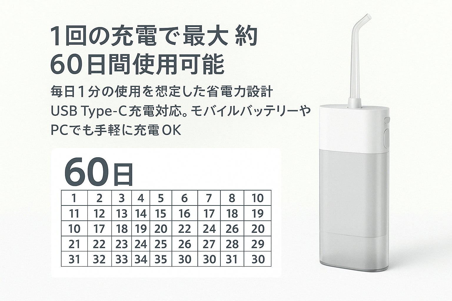 🅰️ フル充電で、約60日間ご使用いただけます(※1日1分使用時)。旅行や出張などでも安心して持ち運べる省エネ設計です。