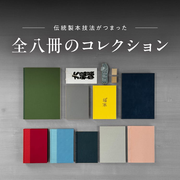 表紙の背の部分と平の部分に別の素材を使った継ぎ表紙でデザイン性に富んだ製本仕様が特徴です。