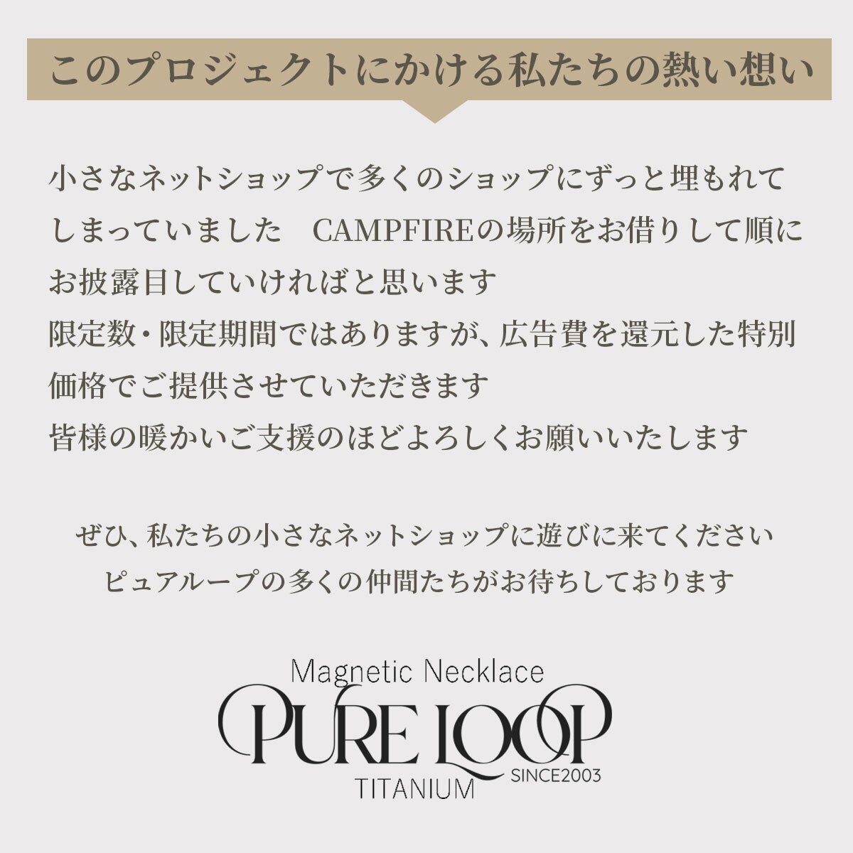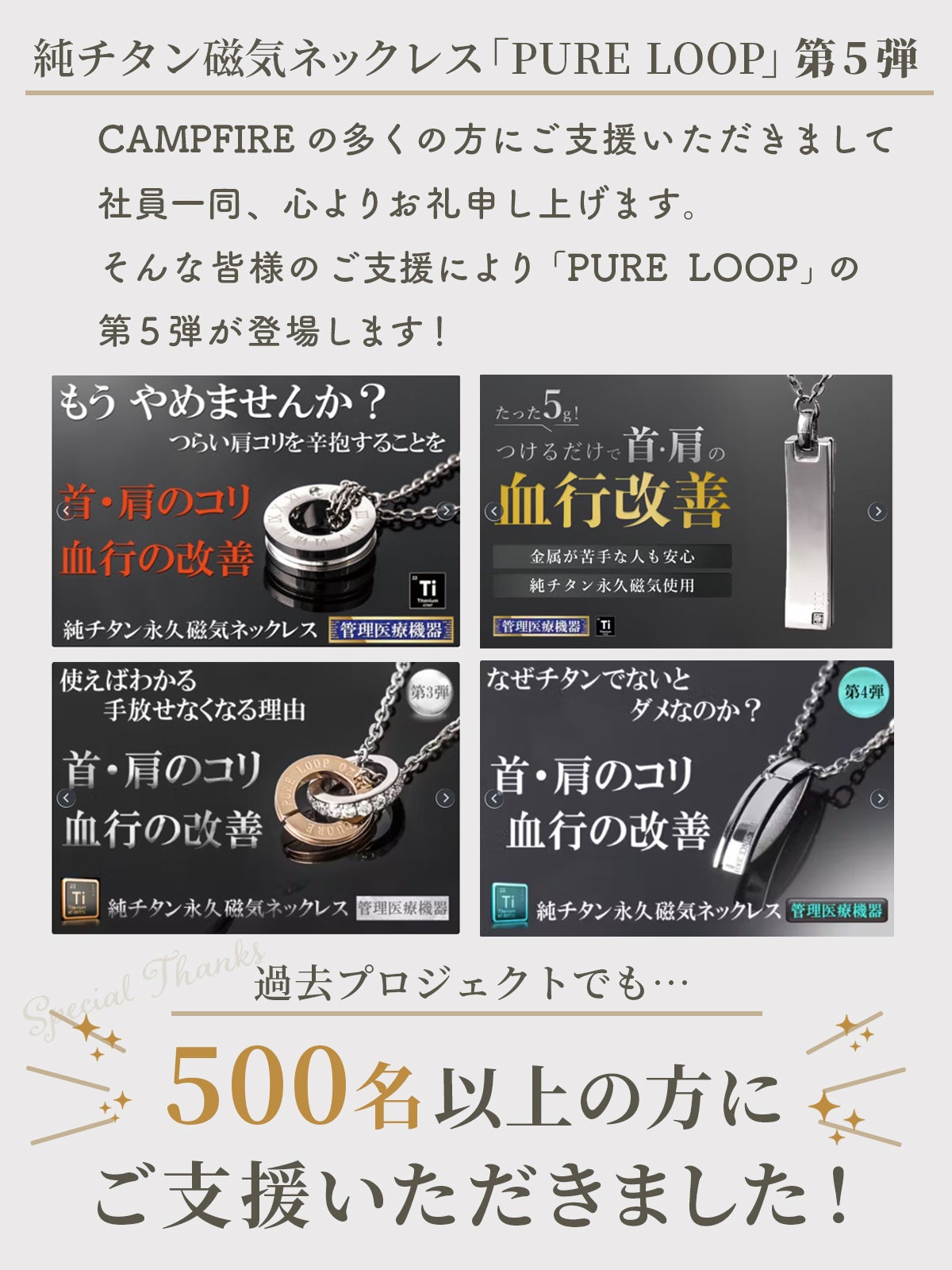 2026/01/22 10:35皆様お世話になっております。この度、たくさんの再販してほしいとの声をいただき純チタン磁気ネックレスPURE LOOPリングタイプのアンコール開催が決定しました!前回のプロジェクトで見逃していた方、購入を忘れていた方などもう一度お得に購入できるチャンスです。ご興味のある方は宜しくお願いします。詳しくはこちらhttps://camp-fire.jp/projects/912770/preview?token=2w4yobsq&utm_campaign=cp_po_share_c_msg_projects_show もっと見る