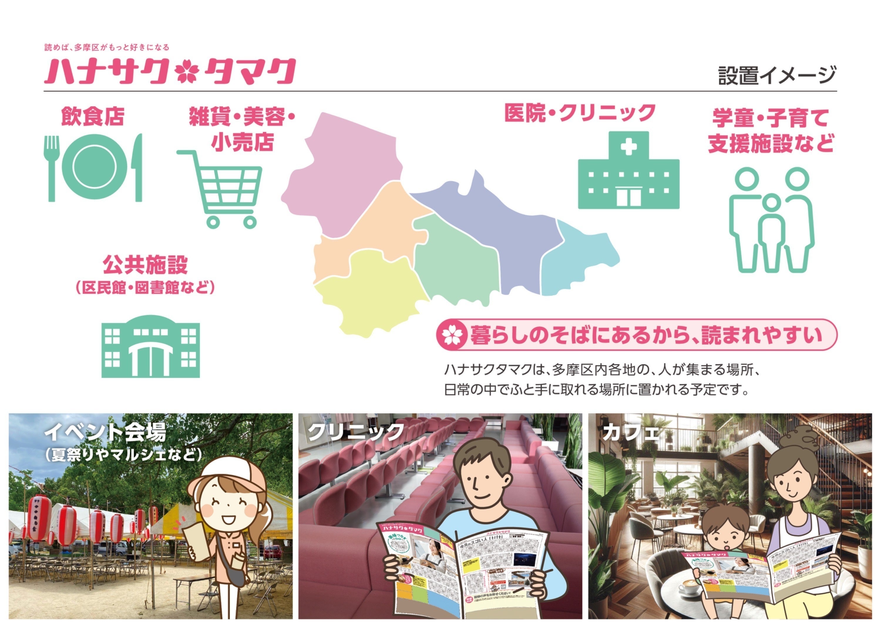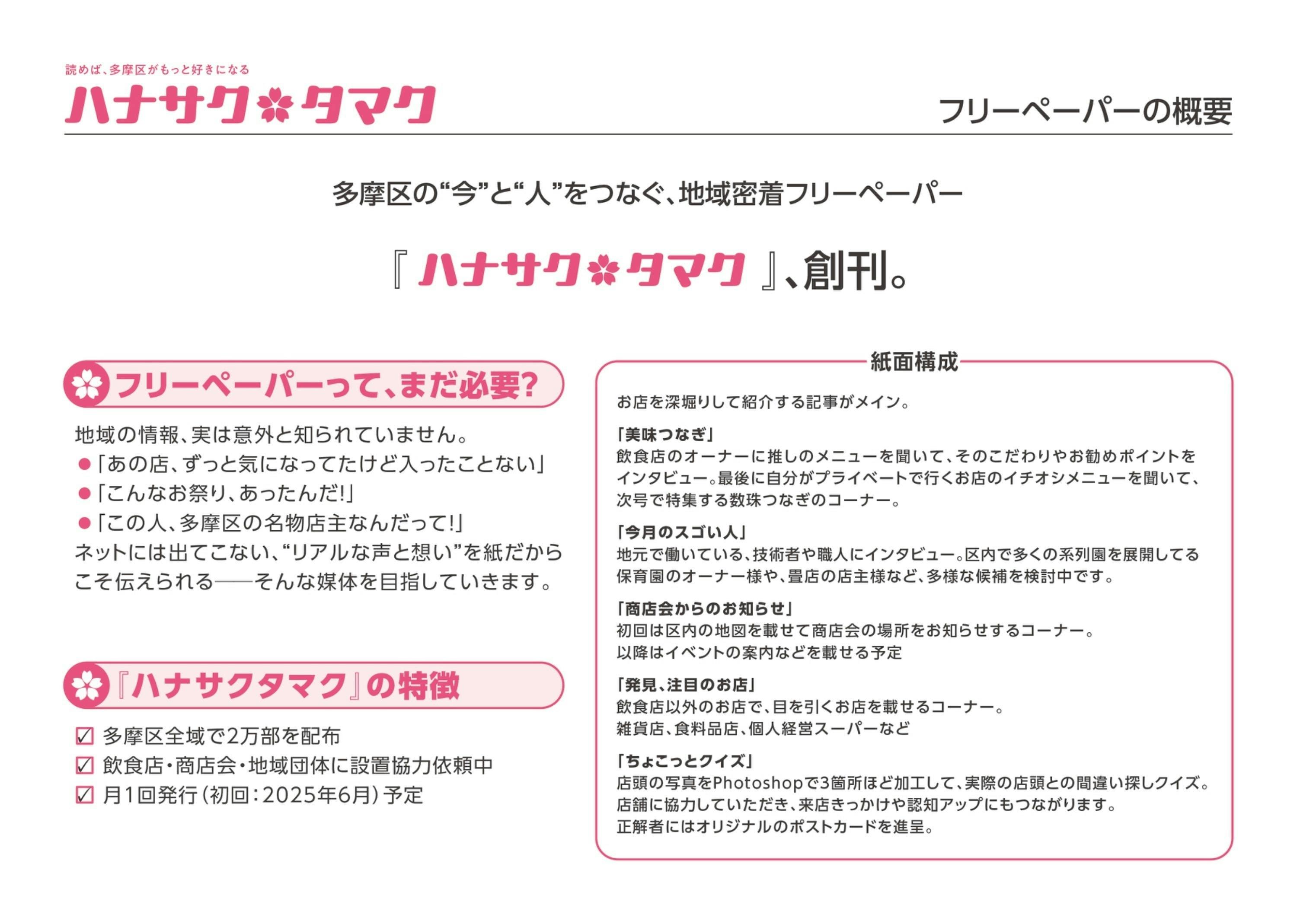 『ハナサクタマク』の創刊号では、次のような内容を予定しています:発行エリア:多摩区全域