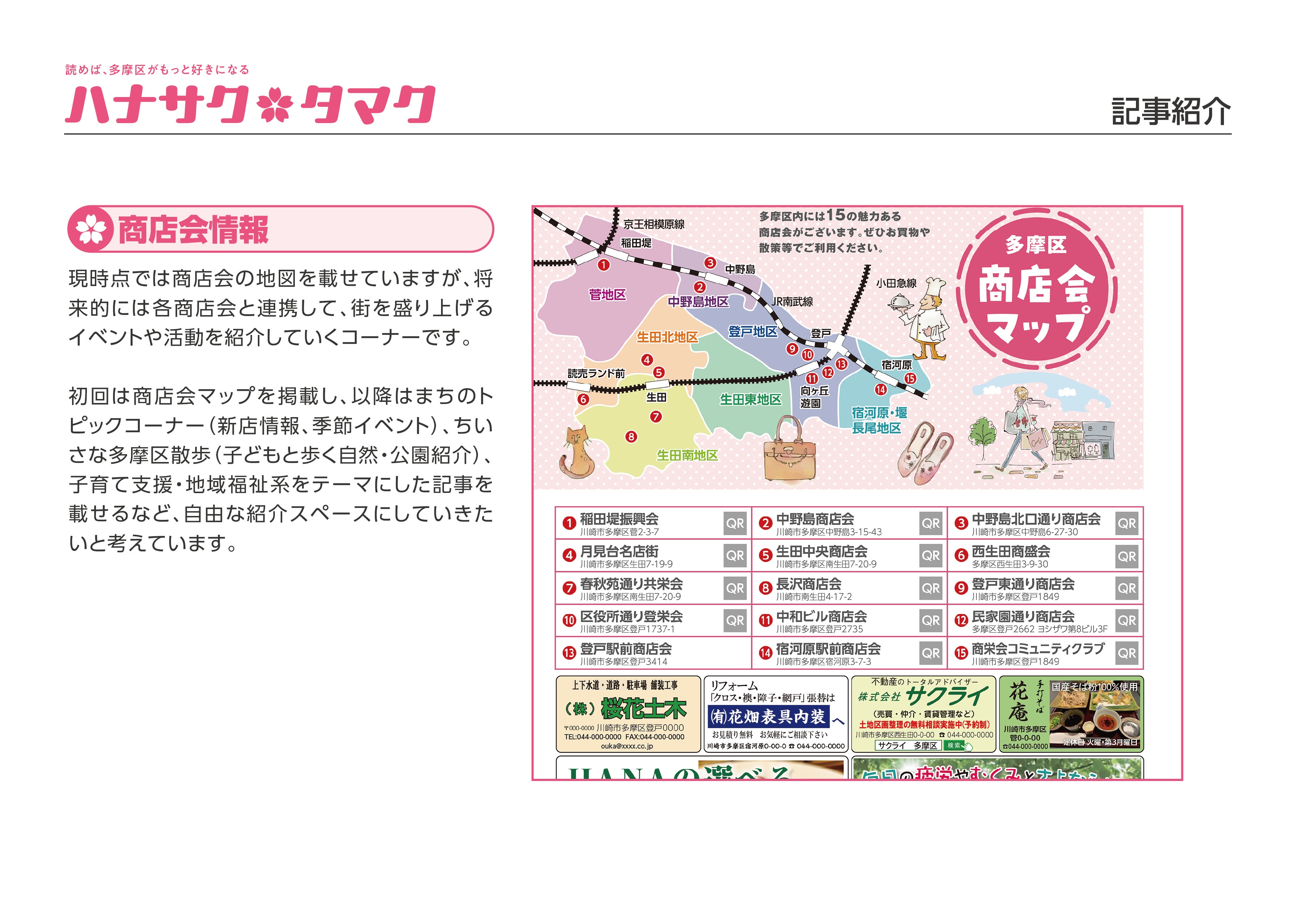 を掲載し、「読めば多摩区がもっと好きになる」 そんなフリーペーパーを目指しています。