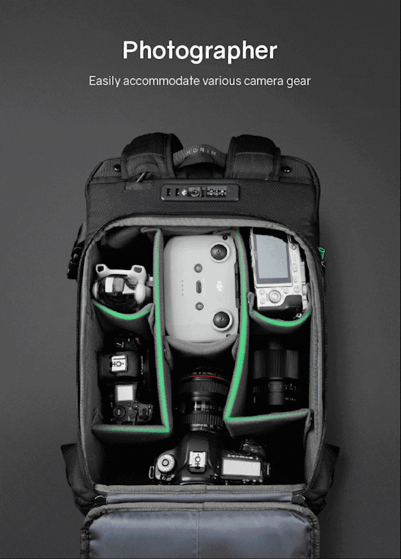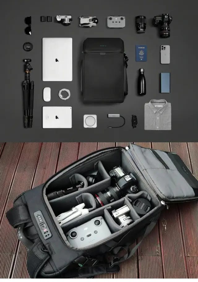 仕事から趣味まで収納自在なカスタム収納、水に強くセキュリティ機能も搭載で出張・旅行も安心なスマートバッグ。