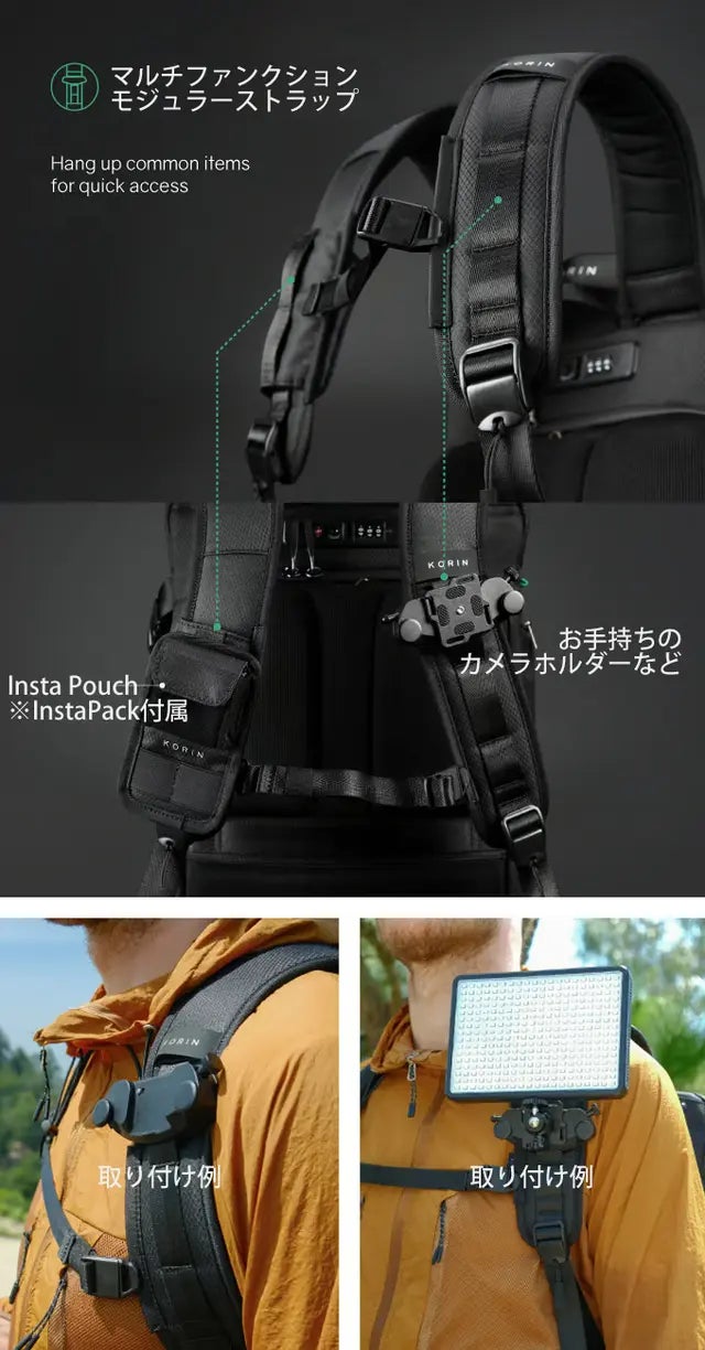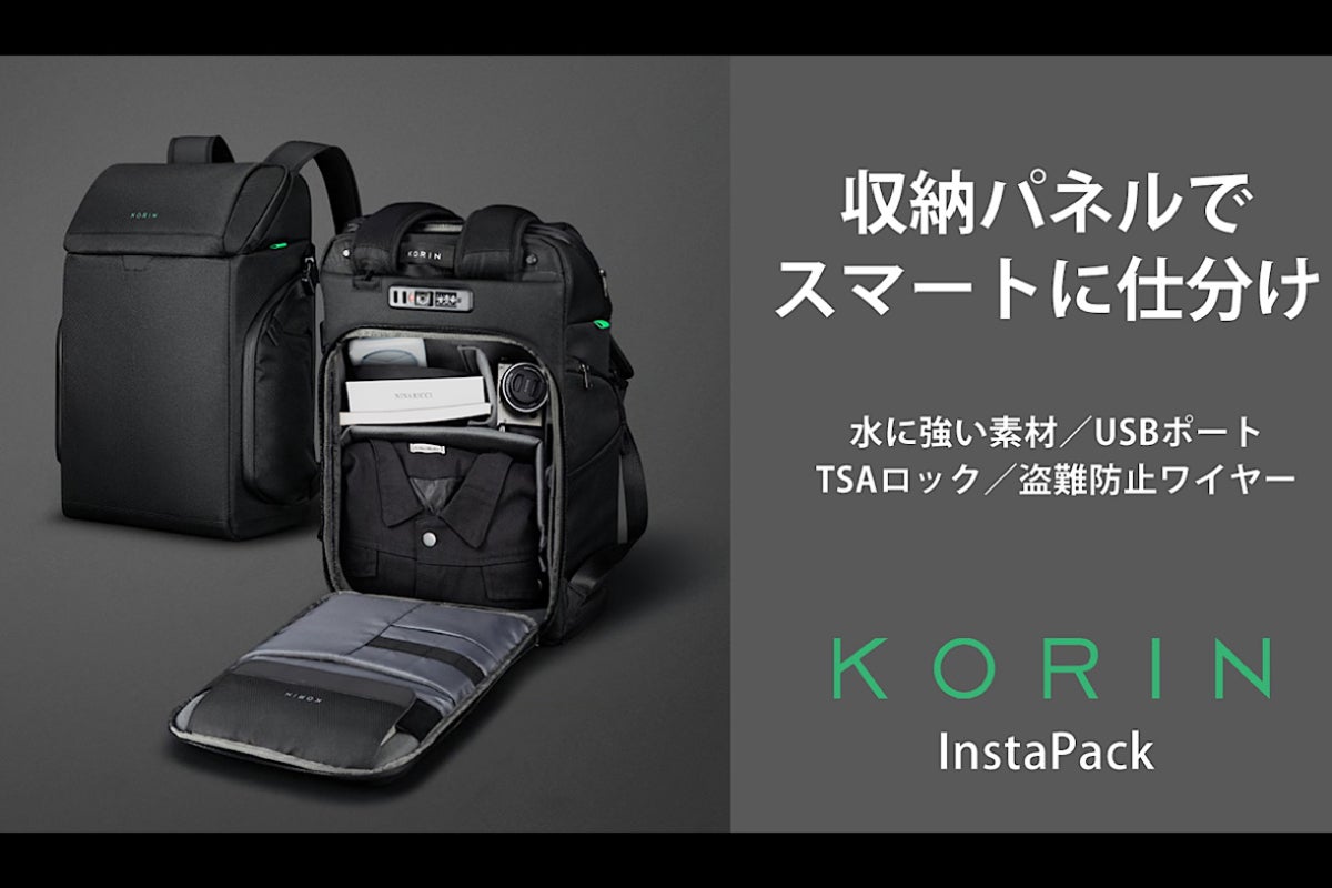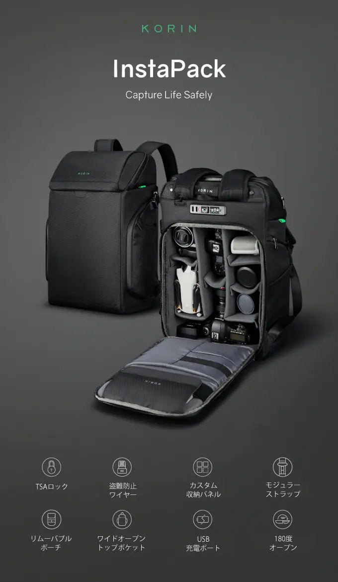 ハイスペックでハイセンスな防犯対策バッグをリリースするKorinDesignの最新作「InstaPack」が日本デビュー!今回のInstaPackは、内蔵するカスタム収納パネルで収納スペースをカスタムできます。さらに、取り外し可能なオプションパーツは単体での使用も可能で、旅先でいつも大きなリュックを背負う必要がなくなります。もちろん、「安心安全を担ぐ」がコンセプトのKorinDesignですので、水に強い素材やTSAロック、ワイヤーロックなどの盗難防止対策も備えております。
