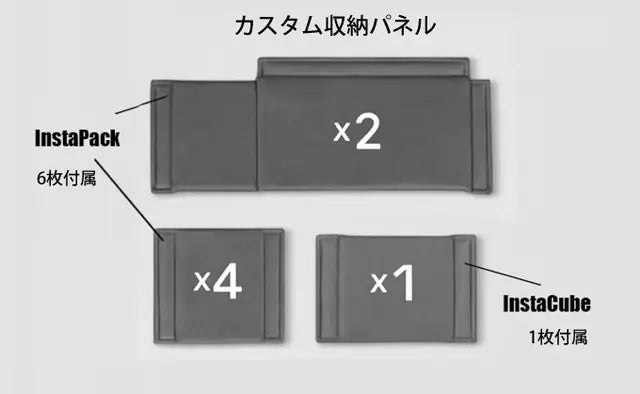 カスタム収納パネルは背面や側面などにベルクロで貼り付ける仕様となっております。InstaPackにはパネルが6枚付属し、オプションのInstaCubeには1枚付属します。