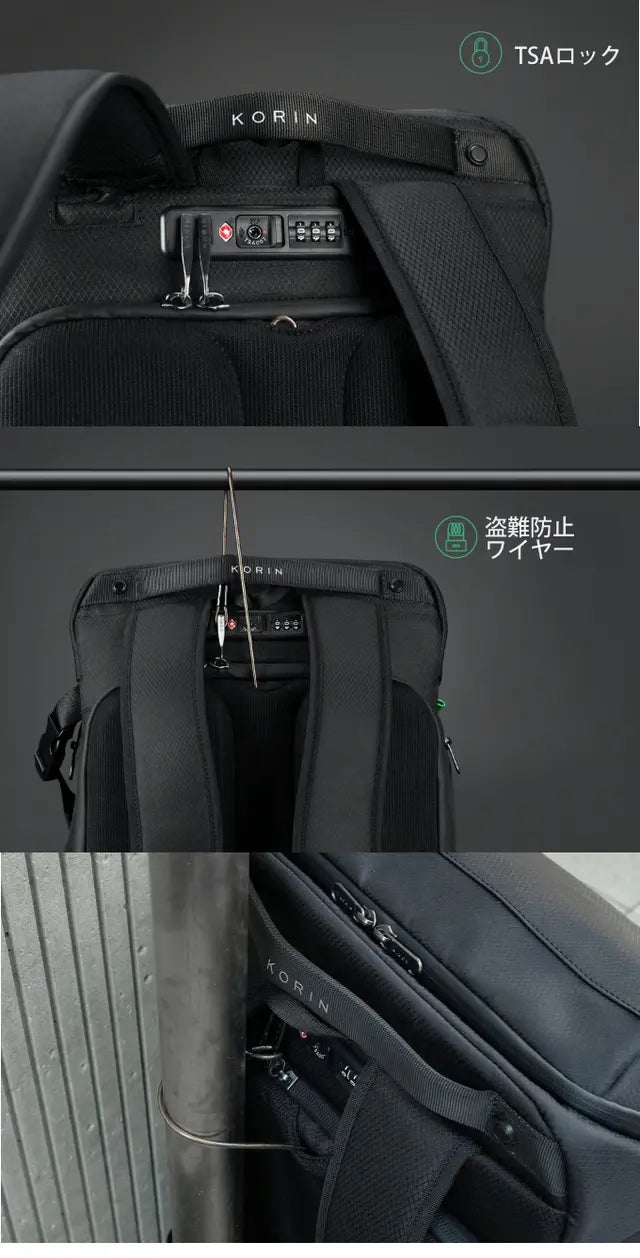 また、KORINならではのTSAロック・ワイヤーロック搭載で、ちょっと席を外すときなどに一人だとその都度リュックを持っていかないといけなかったりする面倒も軽減できるよなというところもおすすめのポイントです。
