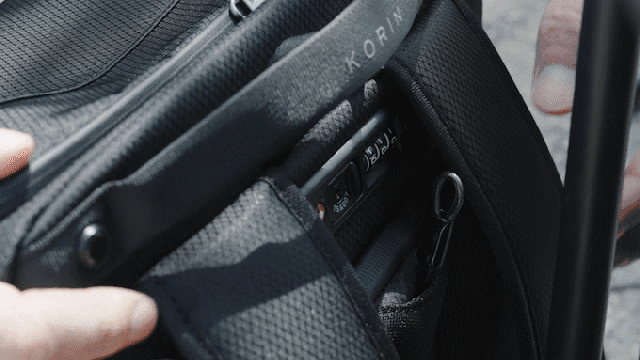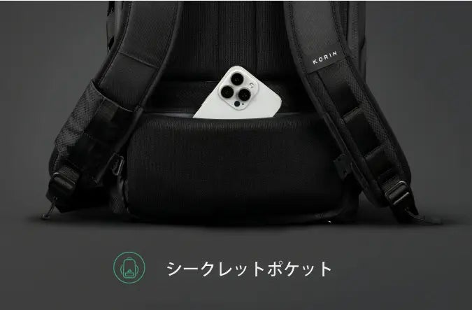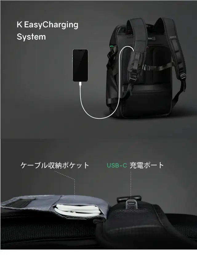 Korinではおなじみのリュックを背負ったままスマホなどのガジェットが充電できてしまう便利機能「K EasyCharging System」です。
