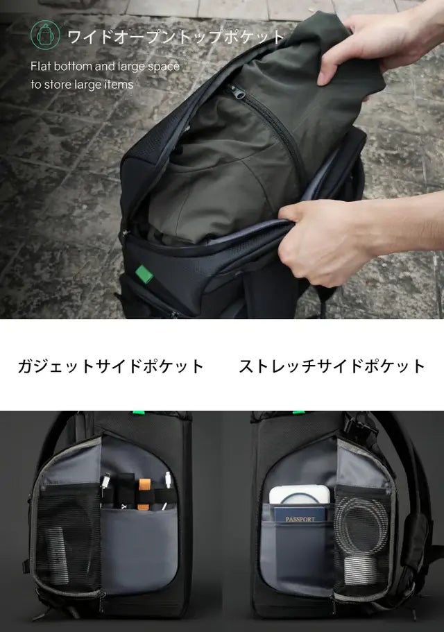ワイドオープンポケットはメインコンパートメント以外で一番容量の多い場所で、バッグの上部に搭載されているため、画像のように上着やすぐ取り出すものをガサッと入れておくのにぴったりです。