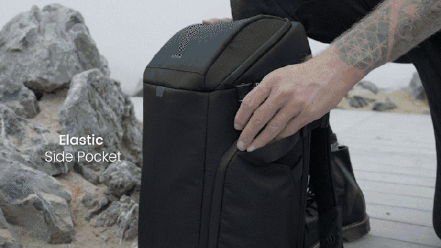 背負った状態で右側はストレッチサイドポケット。こちらは実は2つのポケットから構成されており、1つ目はガジェットサイドポケットのようにファスナーで開閉するポケット。外側はペットボトルや三脚などをズボッと差し込めるポケットとなっております。500mペットボトルも収納できる大きさのポケットです。ギミックは下のアニメーションを参考にしてください。