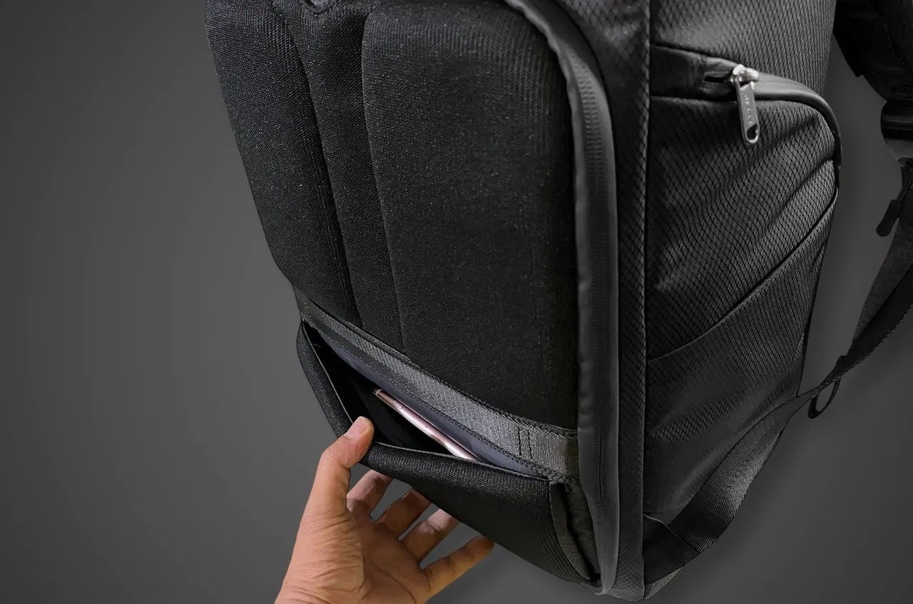 背負った状態で左側がガジェットサイドポケット。ペンやケーブルなど細々したものを整理して収納しやすいデザインとなります。ファスナーで開閉できるデザインで、外側にも1箇所ポケットが配置されます。