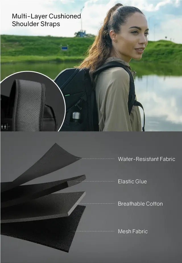 背負った荷物の重さから方への負担を軽減させるために多層クッション構造になったショルダーストラップや、背中のムレをリュックの外に排出しやすいクッション構造、水に強い素材を使用しております。