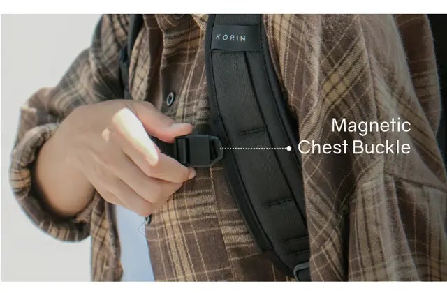 マグネット開閉式のチェストベルトを搭載で、背負ったリュックがブレにくくなります。ストラップはマグネットでパチンと止まる快適設計。
