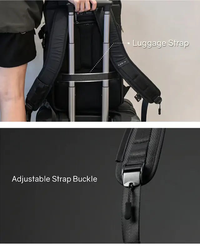 背面にはスーツケースにキャリーオンできるラゲッジストラップを搭載しています。