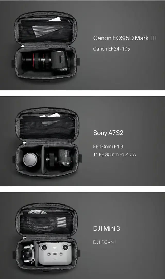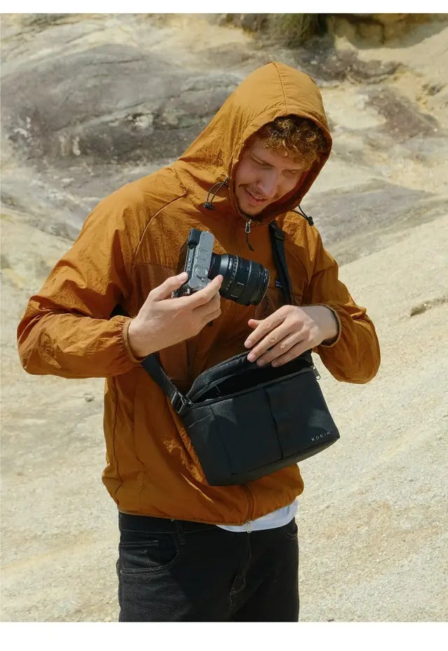 主に、カメラや機材などを収納できるよう、全体をクッションで囲んだ四角いカバンとなります。収納パネルが1枚付属します。旅先でこのバッグだけを持ち出して使うとコンパクトで非常に便利です。