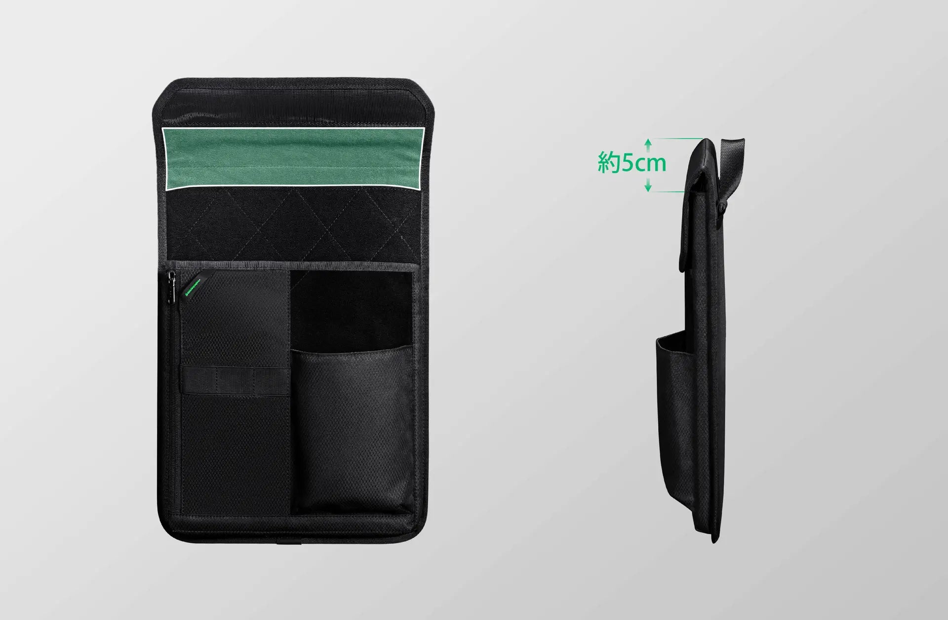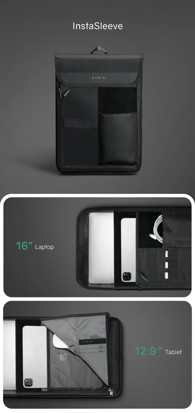 InstaSleeveはメインコンパートメントの奥にベタッとベルクロで貼り付ける、まさに脱着可能なパソコンケースです。16インチのノートPC、12.9インチのタブレットまで収納できるため、InstaPack自体のポケットには収まらないサイズのものを収納できます。