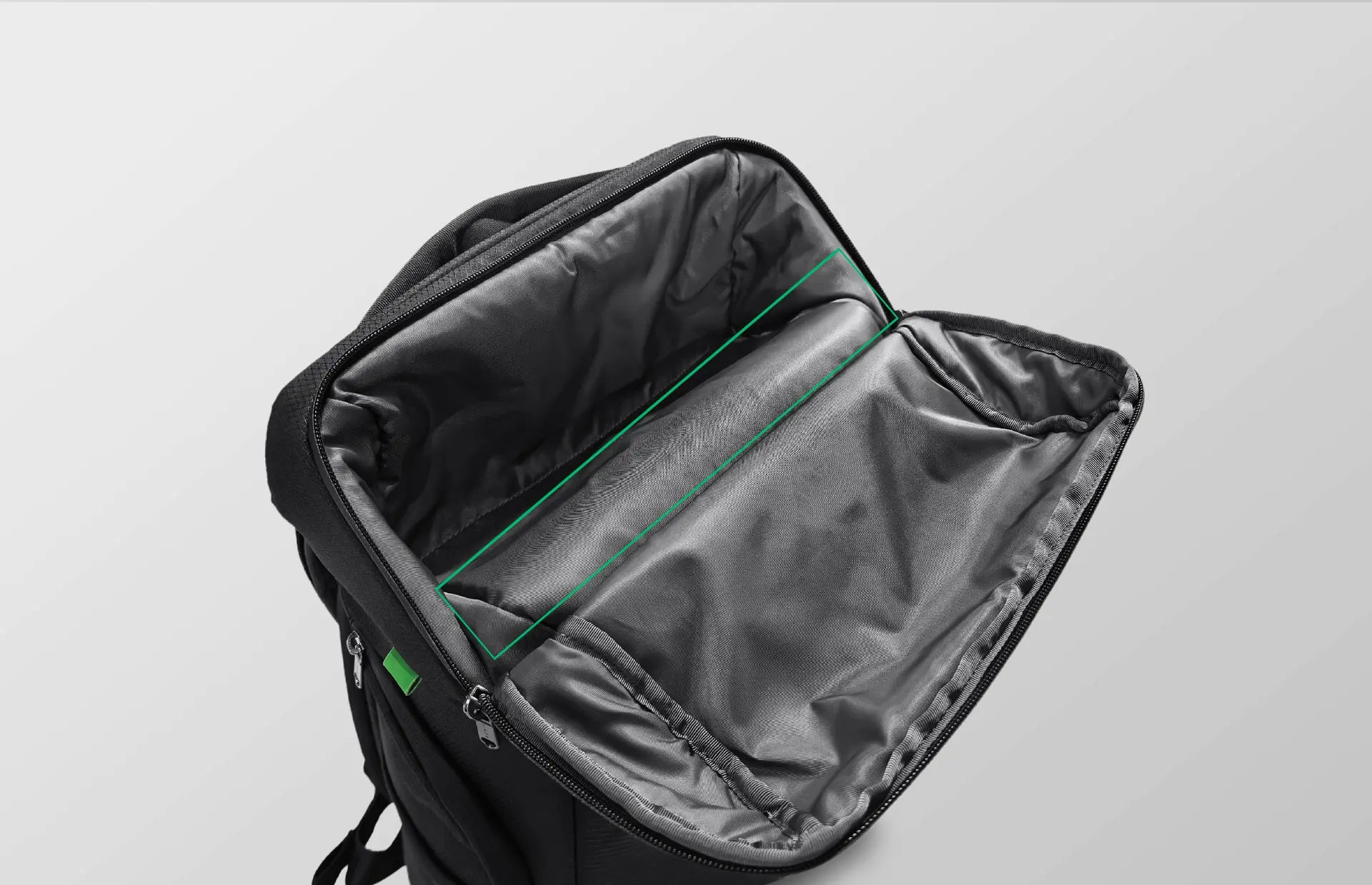 メインコンパートメントの高さは、約35cm、InstaSleeveの高さは約39.5cmのため、上の画像の緑色に塗っているあたりがワイドオープントップポケットの底部分に干渉する(突き上げる)デザインのため、InstaSleeve搭載時はワイドオープントップポケットの底が平らにならず、下の画像のようになります。