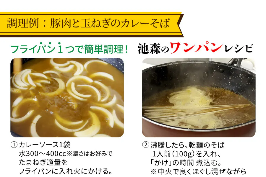 そばだけじゃない!スパゲティーにも合います。そば同様フライパン1つで本品と水300~400㏄を沸かし、スパゲティー100gを入れて煮込めば簡単カレーパスタに!