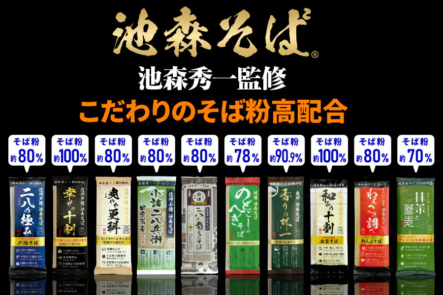 池森そばには、バラエティ豊かな10種類のラインアップが揃っており、それぞれ異なる味わいや食感を楽しめます。どれも池森秀一監修のもと、そば粉高配合にこだわったオリジナル商品を販売しております。