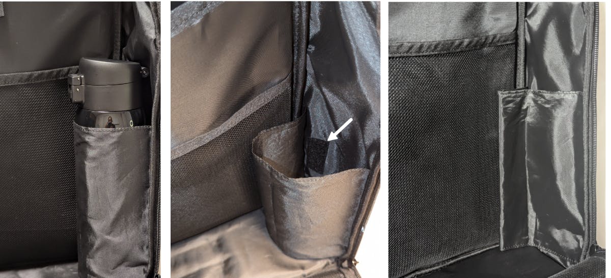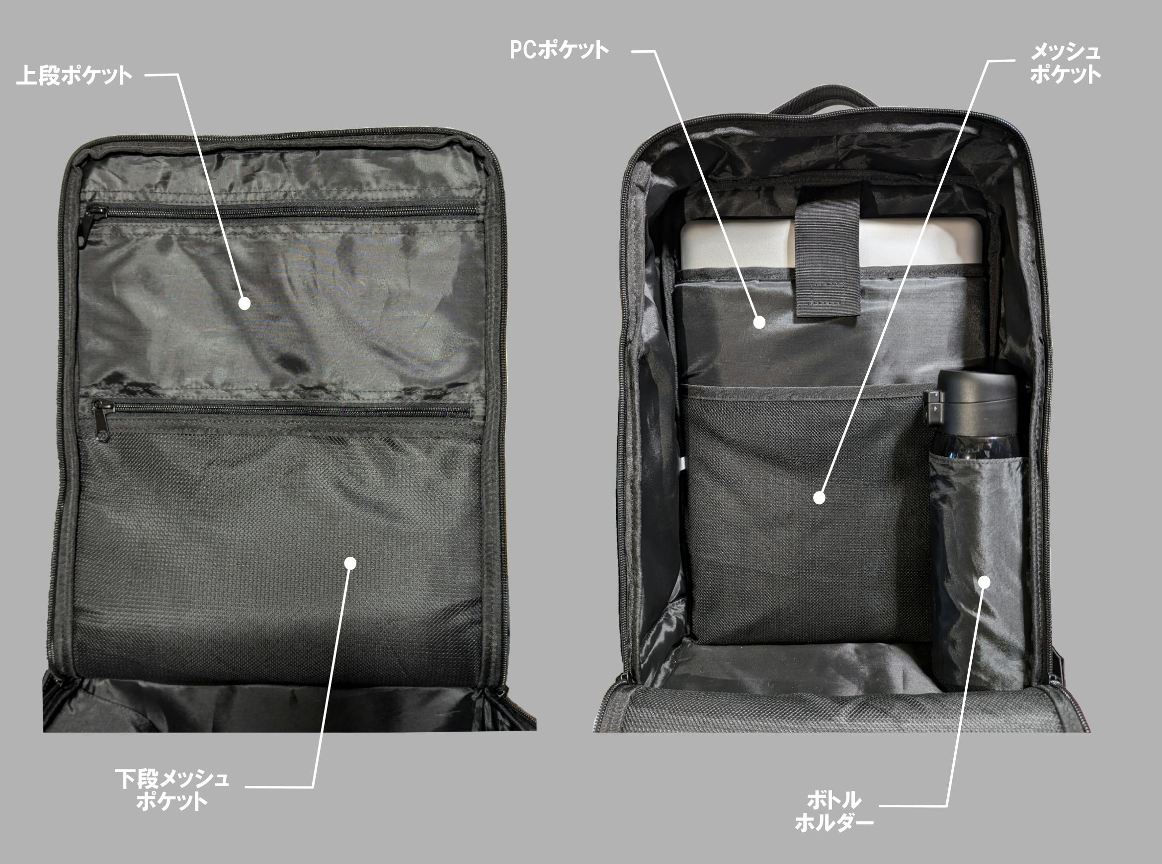 サイドポケット以外にも、各種のポケットをとりつけています。そのため、モノがリュック内で迷子になりにくくなります。
