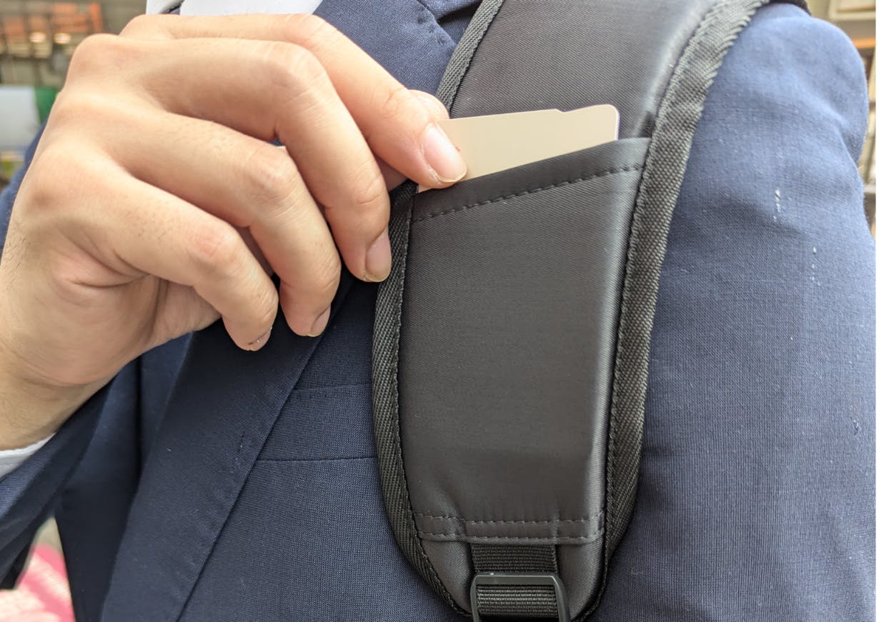 通勤時に使用するICカードや各種のカードを入れることができますので、カード利用の都度リュックを下ろす必要がなくなります。