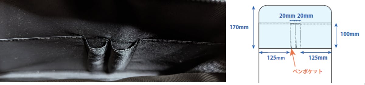 ポケット内部には、さらに100×125mmのポケット2個とペン入れ2つを付けています。