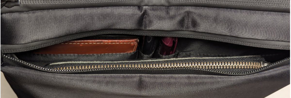 これは前面の上段にあるポケットで、上記の写真では厚さ3cmの長財布を入れています。