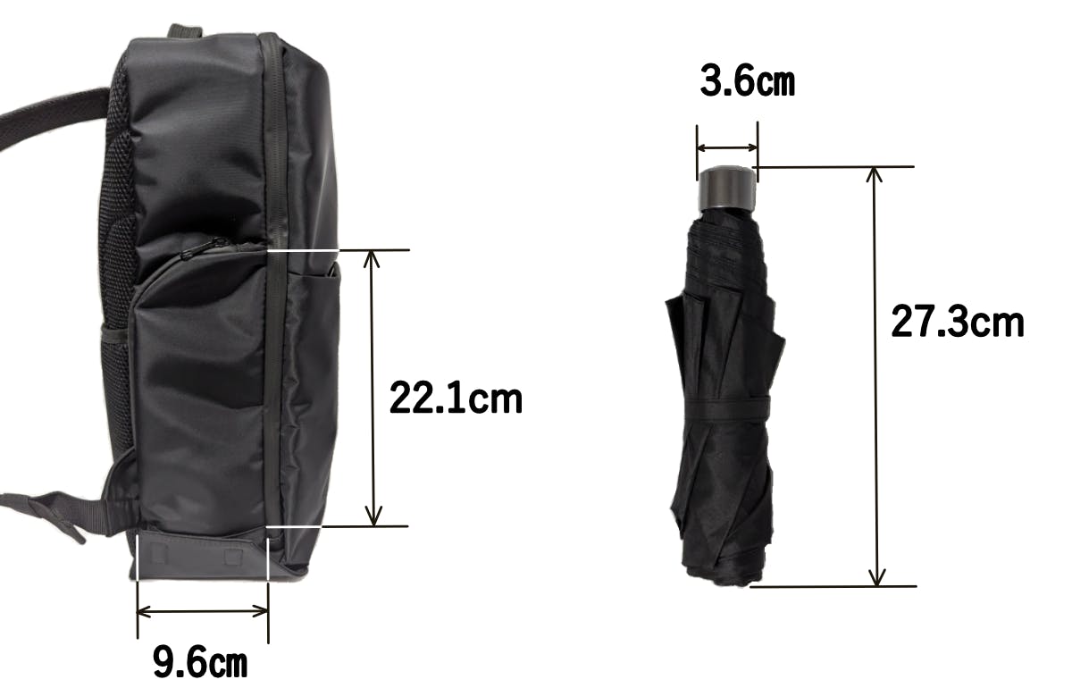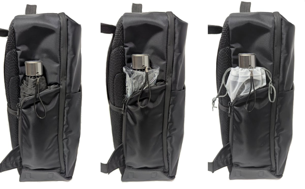 その点、上の写真の中央と右のように、折畳み傘を袋に入れてサイドポケットに入れておけば、傘の扱いに困ることもなくなります。